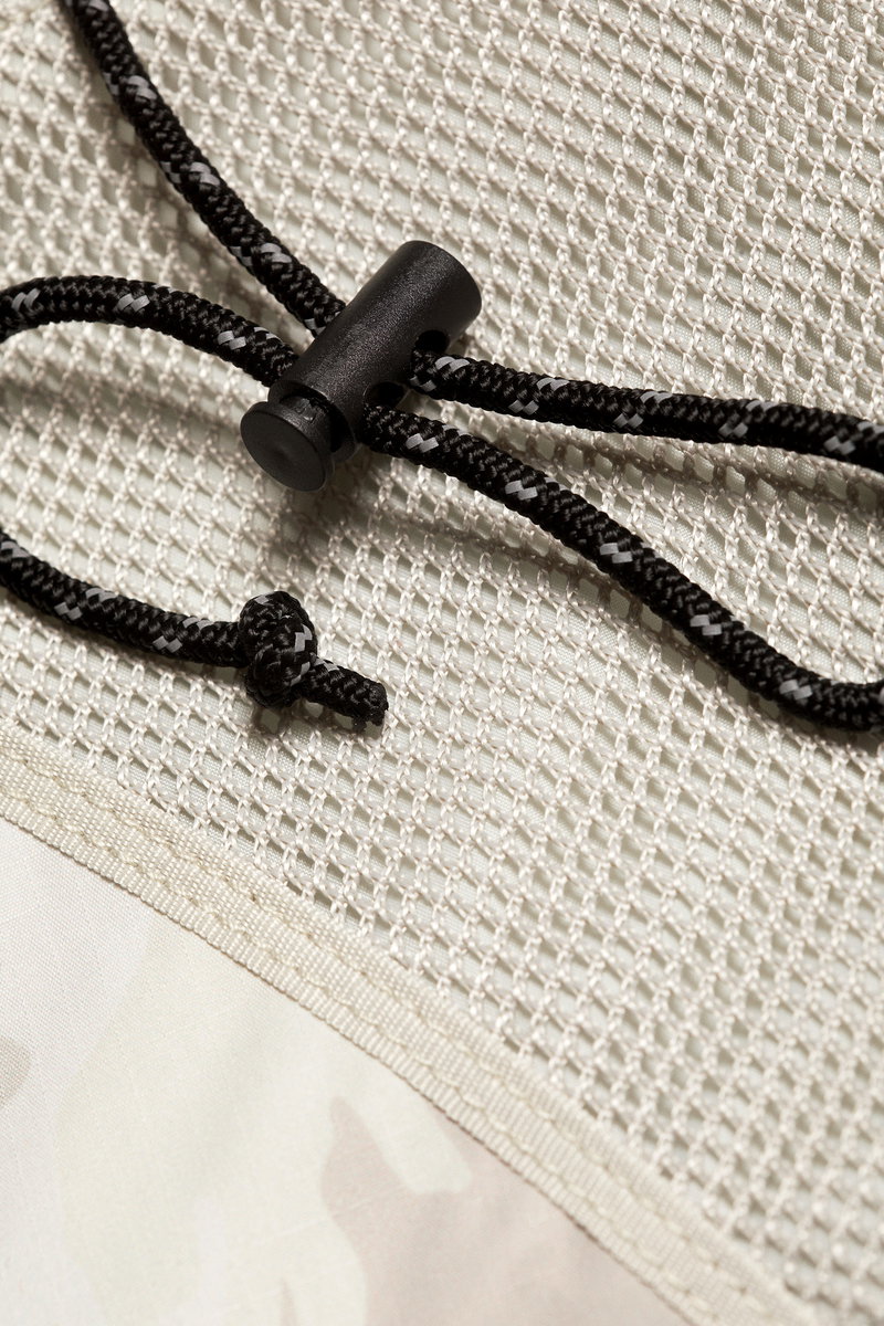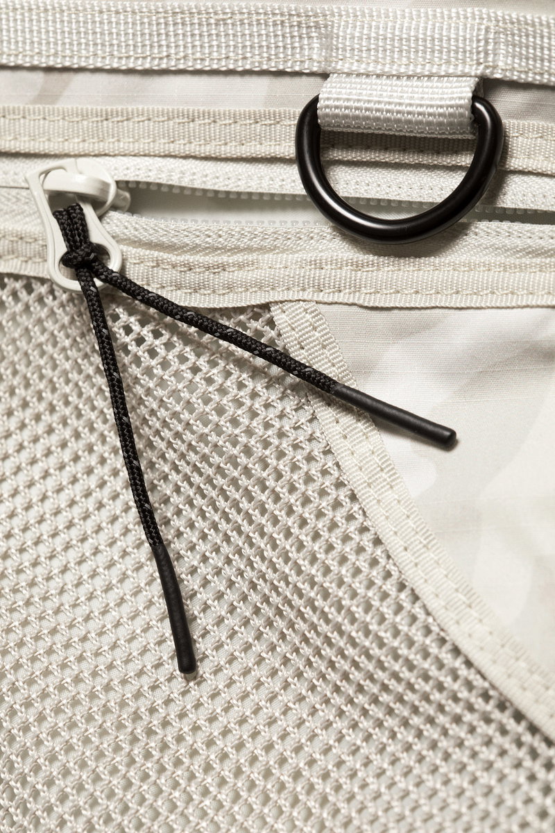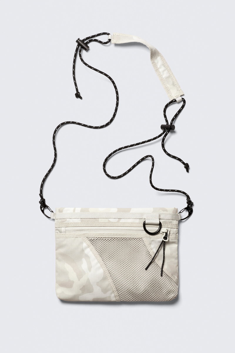 A mini crossbody bag crafted from recycled polyester dobby with a textured feel. Designed with a compact rectangular shape and a diagonal mesh front panel with a zipped outer pocket above. The top zip opens to the main compartment, keeping small essentials secure. Finished with an adjustable cord shoulder strap with stoppers and clip fastenings.
