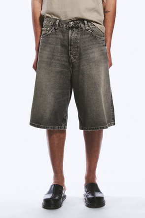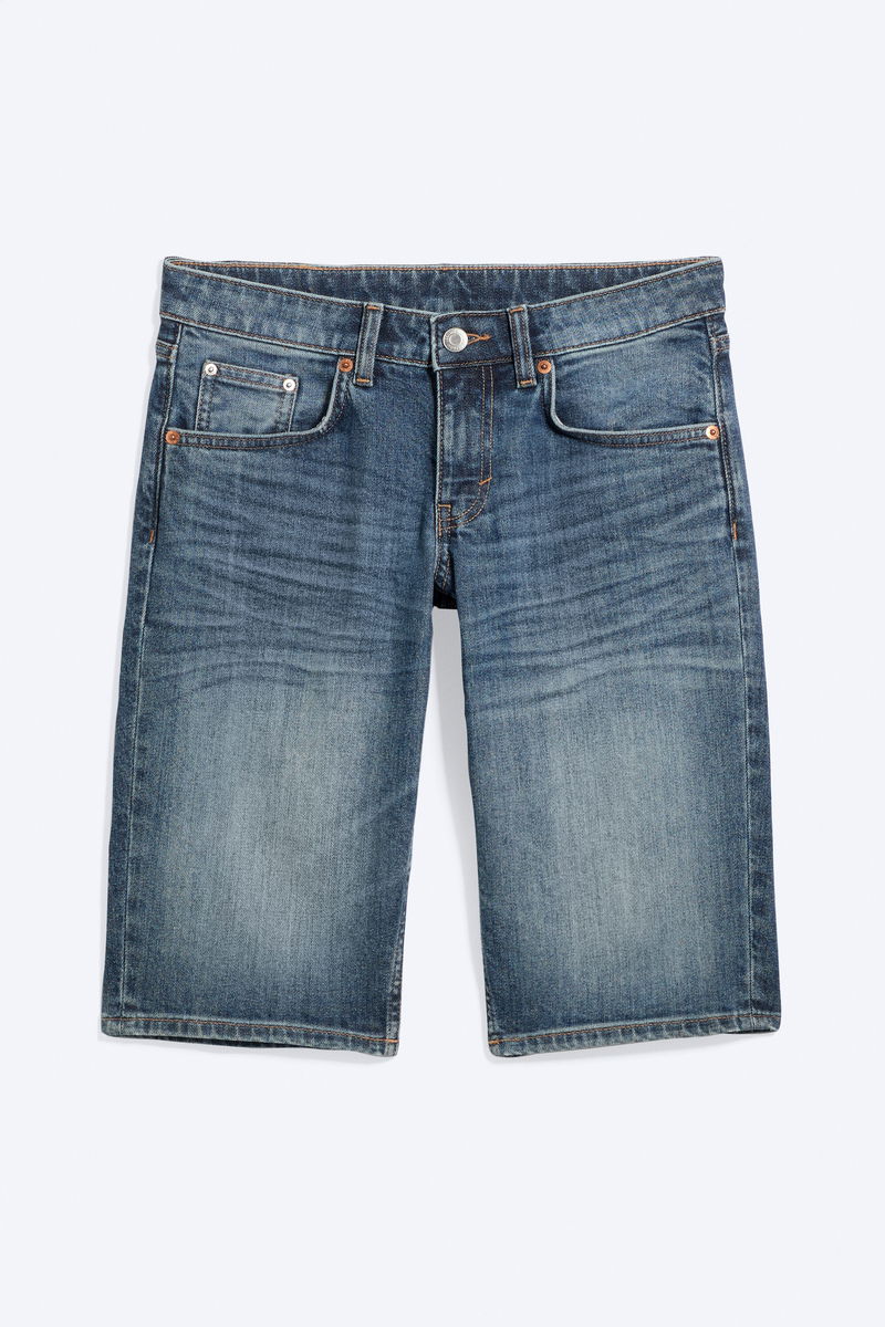 A pair of low-rise denim shorts with a slim fit and knee-length leg, crafted from super stretch cotton denim. Designed with a classic five-pocket construction and a zip fly with button closure.