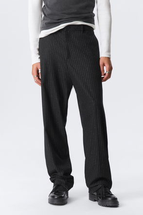 A pair of suit trousers cut to a relaxed fit, featuring a drawstring waistband, slanted side pockets, back welt pockets, and sewn front and back press-creases.