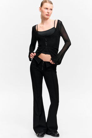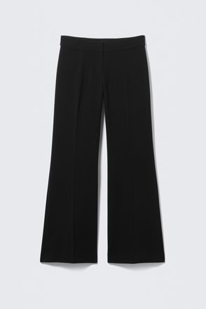 A pair of slim-fit suit trousers with a low waist, flared leg and long length. These trousers are crafted from a stretchy recycled polyester and viscose, featuring a zip fly with hook-and-bar closure, no side pockets, darts at the seat, and back welt pockets.