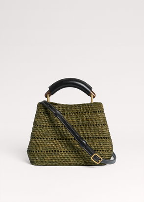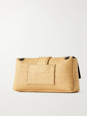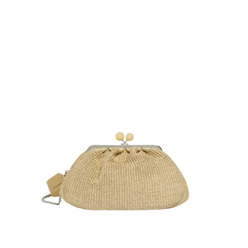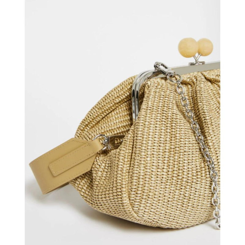Elevate your style with this Weekend Max Mara clutch made of raffia-effect fabric. The interior is lined in striped twill and features a convenient storage pocket with the Weekend Max Mara label. This clutch comes with a double removable shoulder strap in leather and chain with leather detail, measuring 31 x 13 x 21 cm.