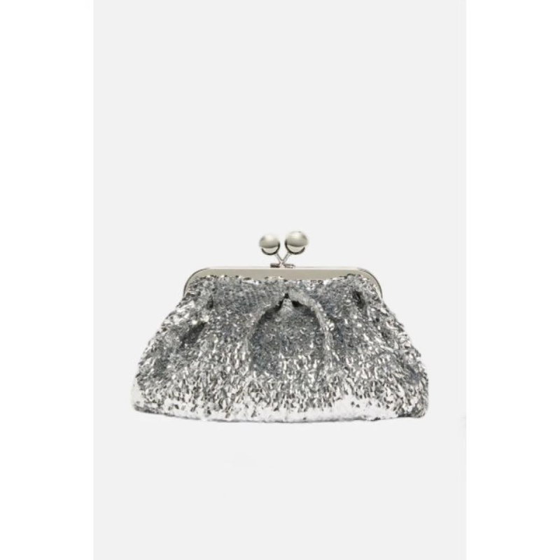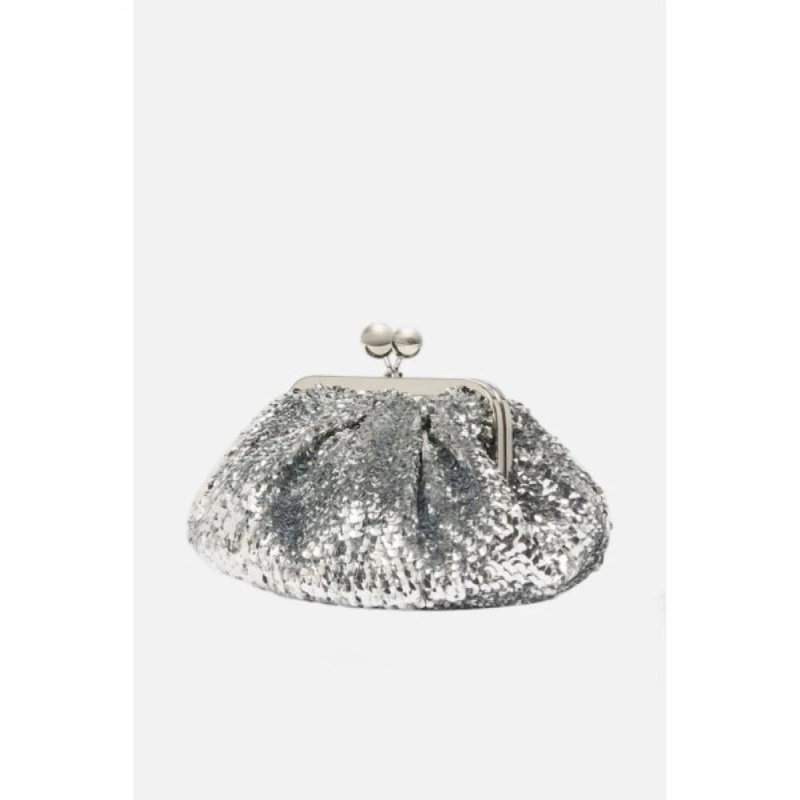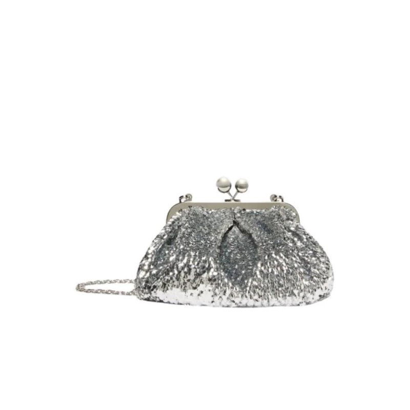 Weekend Max Mara Pasticcino Bag Small is a sequin-covered satin clutch with long embroidered fringe, designed to add a statement finish to evening and occasion looks while offering versatile carry options.