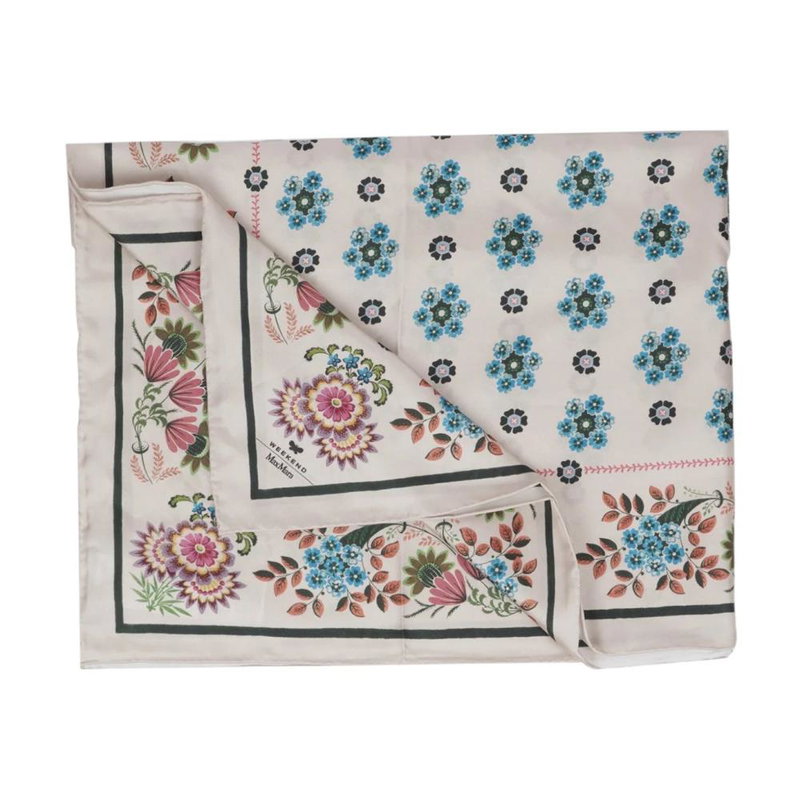 Weekend Max Mara Printed Silk Twill Foulard is a 90 x 90 cm silk scarf that adds a refined touch of color to outfits. The square foulard features an all-over floral print and the Weekend Max Mara logo in the corner.