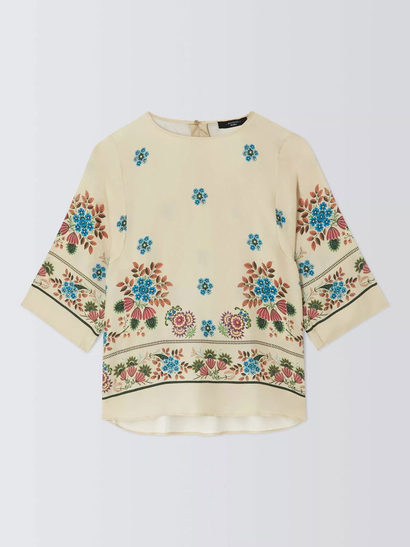 A silk blouse, featuring a floral pattern and three-quarter sleeves. Its regular cut and round neck create an easy shape, making it an elevated choice for any plan.