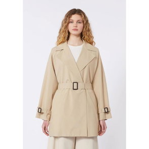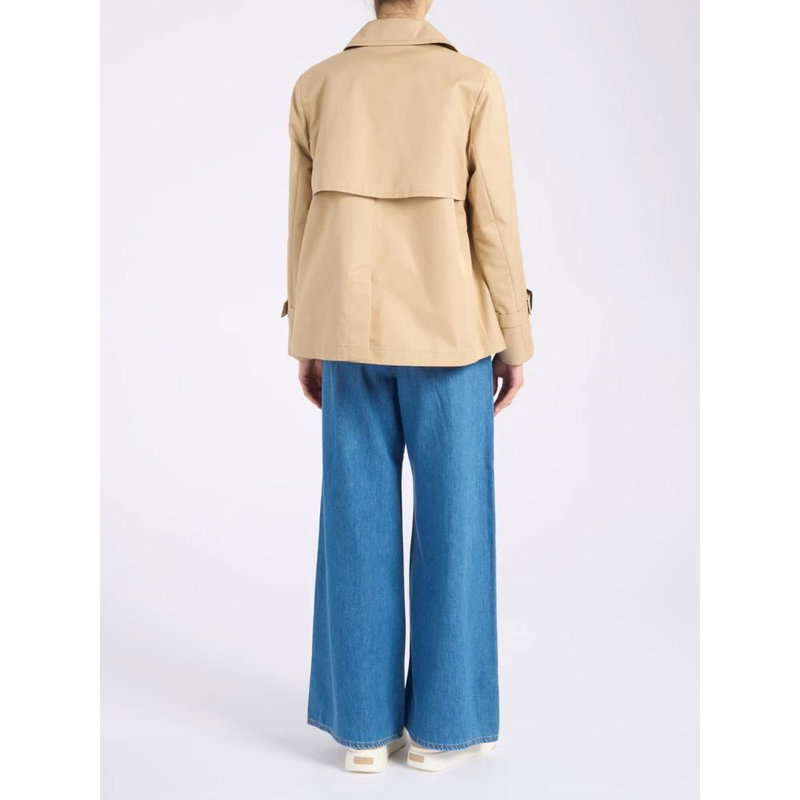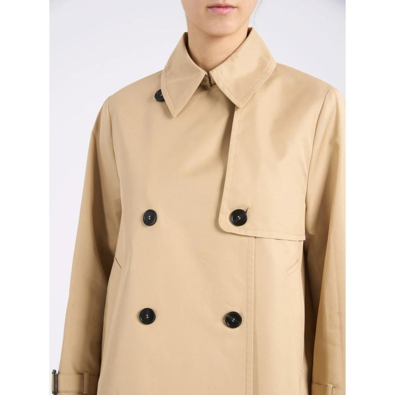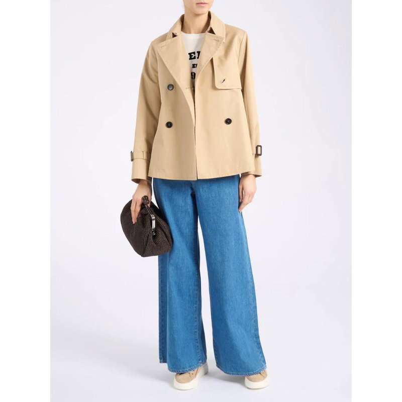Weekend Max Mara Wkdbiglia Trench is a short, double-breasted trench in water-repellent technical gabardine, designed for citywear with a flared silhouette and practical weather protection.