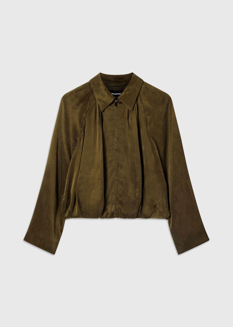 Crafted in a versatile khaki shade, it features a bubble hem, wide sleeve hems and a zip fastening with soft pleat detailing through the body. Lightweight and easy to wear, it’s perfect for brighter days or layered under a coat when the breeze sets in.