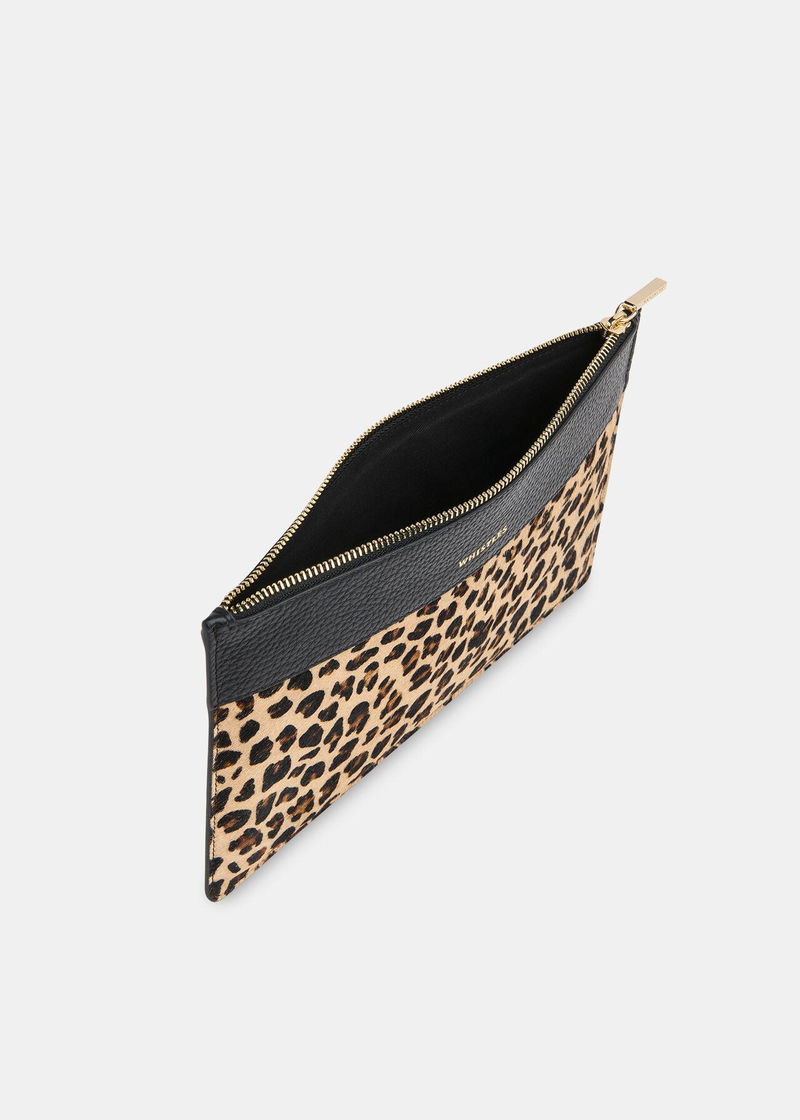 Compact yet statement-making, our Leopard Panel Clutch is the perfect finishing touch to elevate your evening look. It’s crafted from leather and printed with a bold leopard pattern, complemented by a sleek black band for subtle contrast. Designed to keep your essentials—keys, cards and makeup—securely in one place, it’s the ultimate companion for your evening soirées.