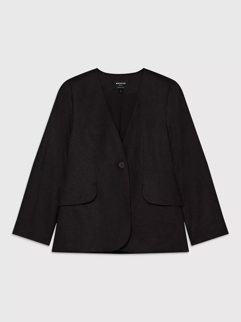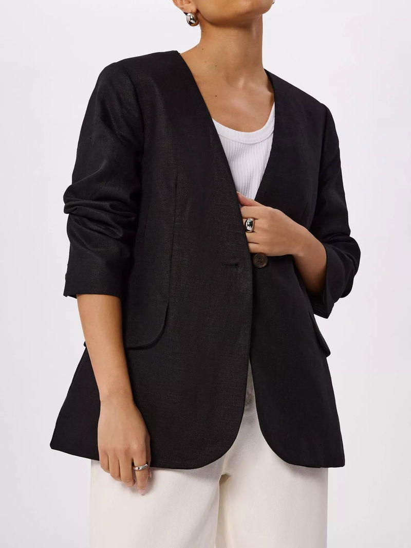 This petite linen blazer delivers sharp style and lasting comfort in a cut made for you. Its clever tailoring creates impact without effort, while the collarless V-neck and button fastening keep things smart and easy.