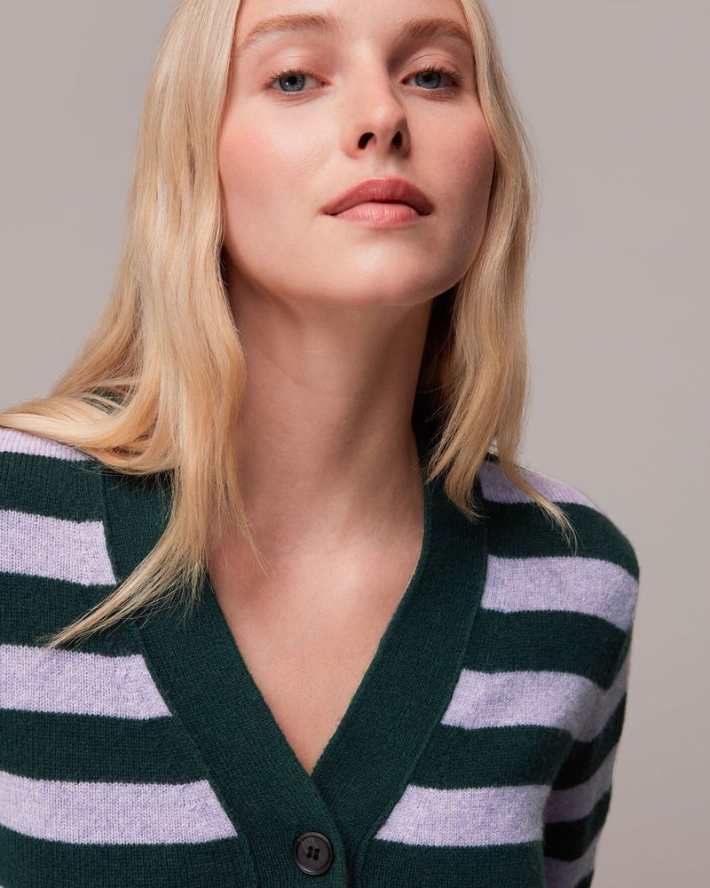 Crafted from 100% responsible wool with bold purple stripes, this cardigan is designed to be a relaxed fit in a cropped length that keeps you warm come winter. Layered with T-shirt or hick-neck rib knits and staple jeans for a casual look.