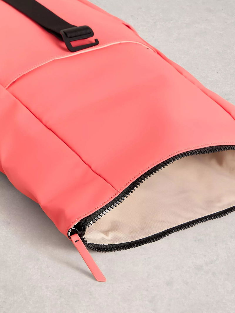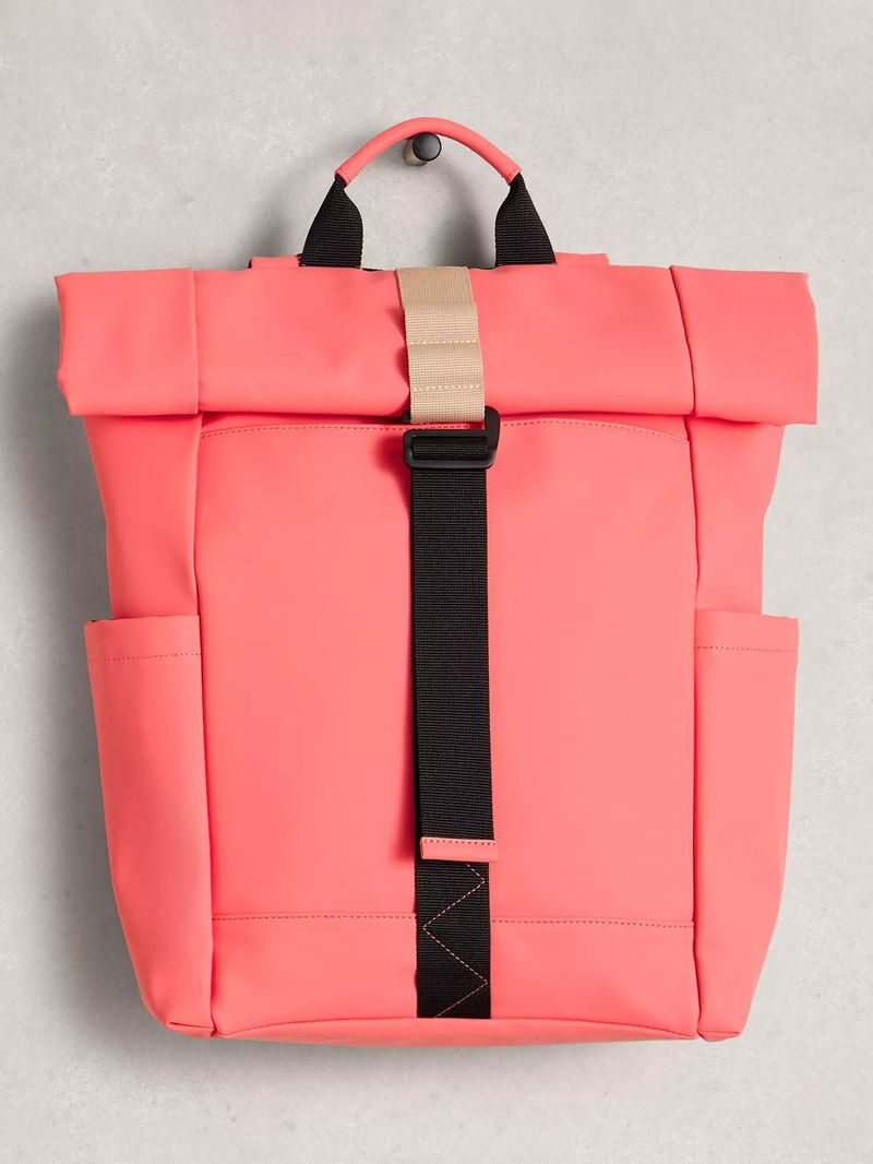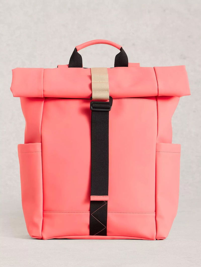 A roll top backpack - the perfect commuter backpack with a buckle closure. Features side pockets, great for a water bottle and umbrella. Complete with a laptop-padded pocket.