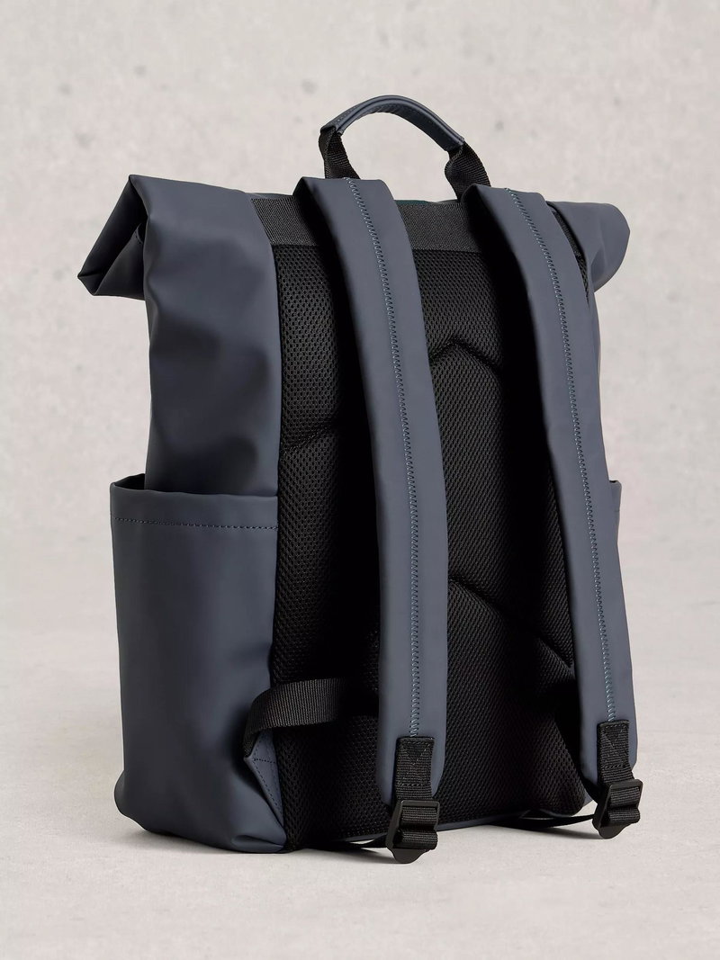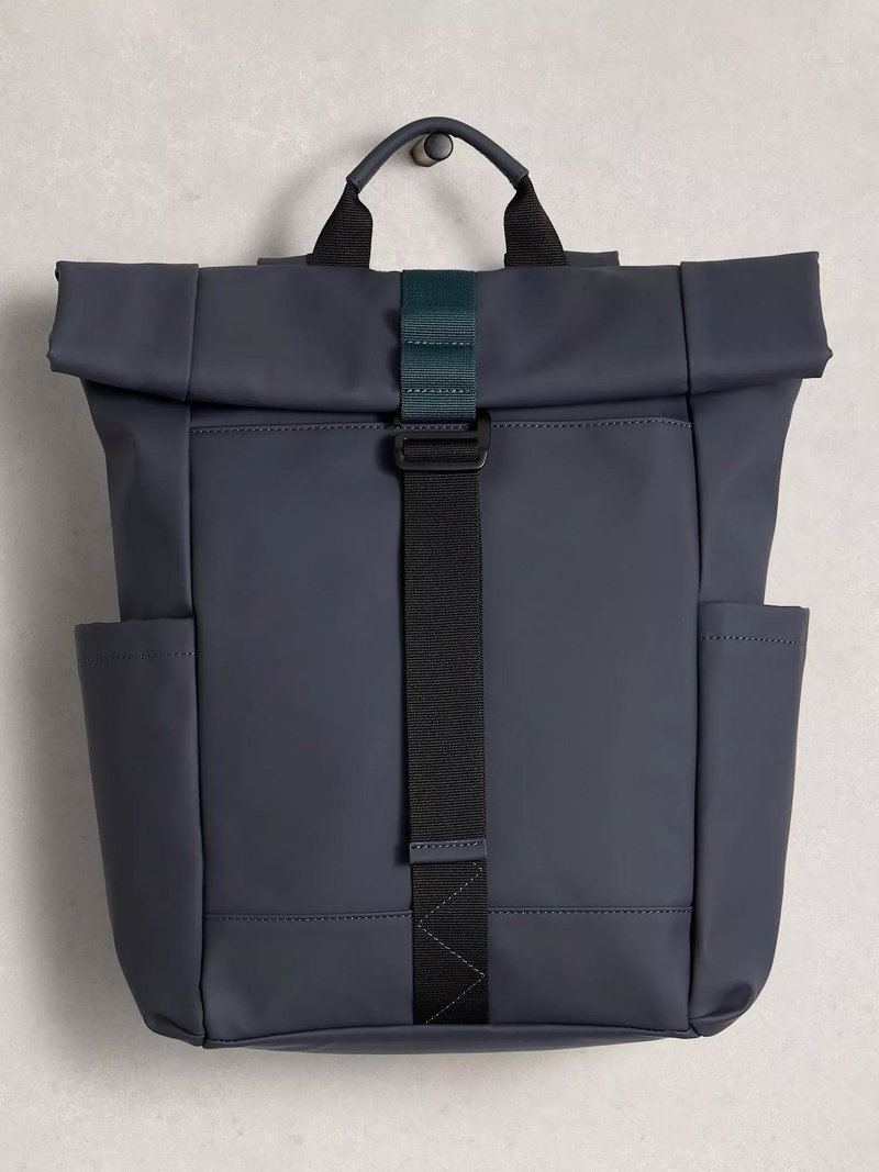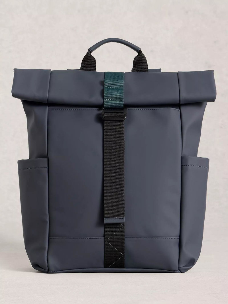 A roll top backpack - the perfect commuter backpack with a buckle closure. Features side pockets, great for a water bottle and umbrella. Complete with a laptop-padded pocket.