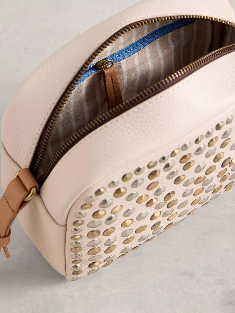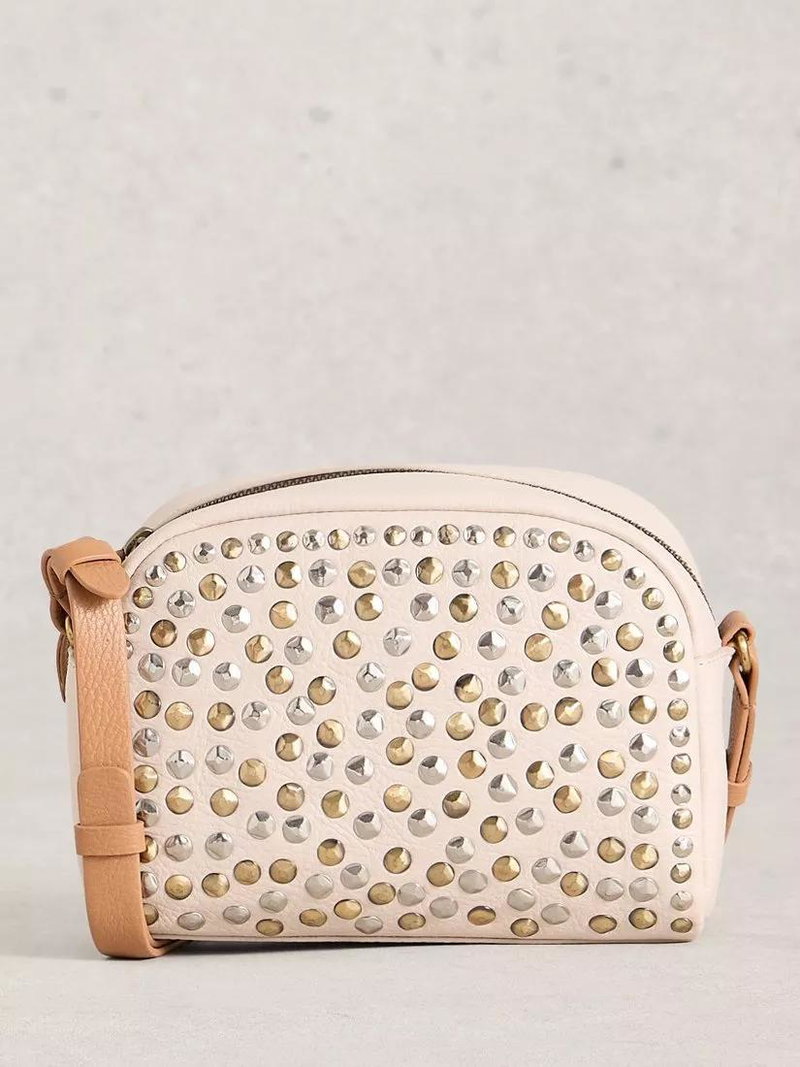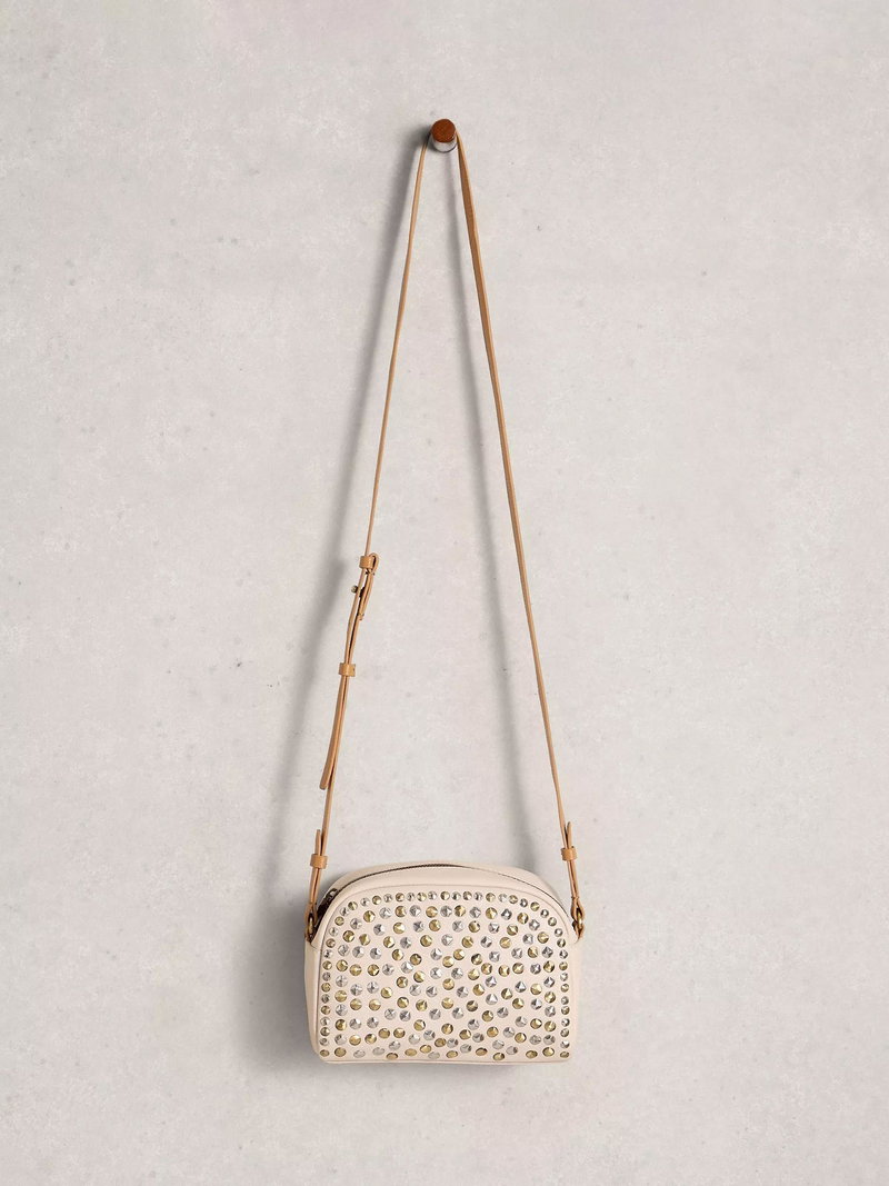Bella Studded Pure Leather Crossbody Bag, White/Brown