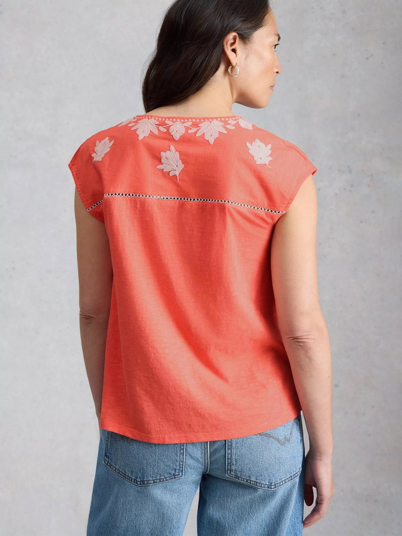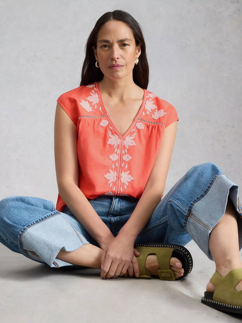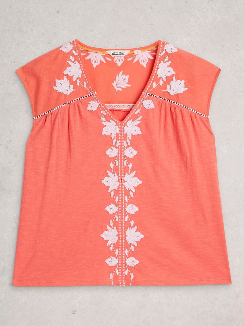 Fliss Embroidered Floral Top, Coral