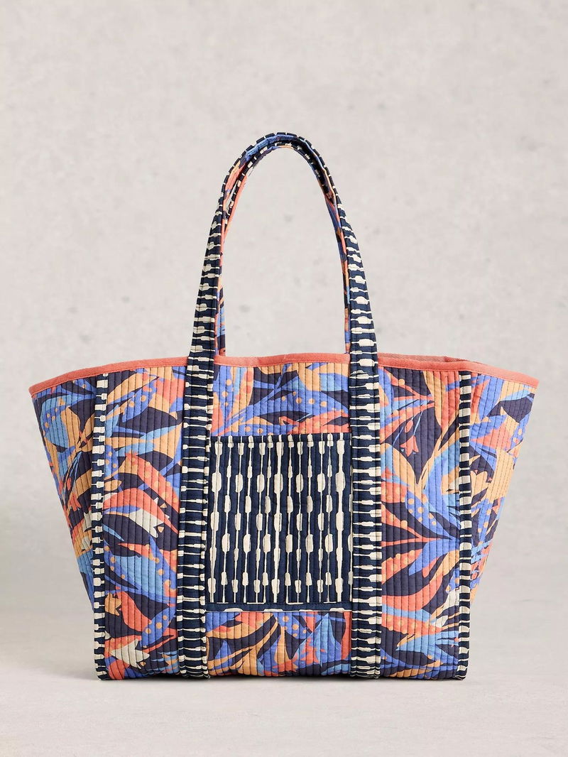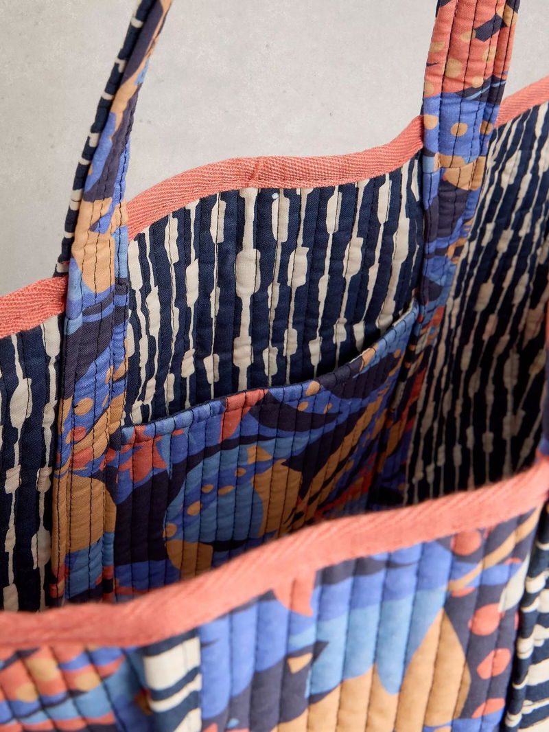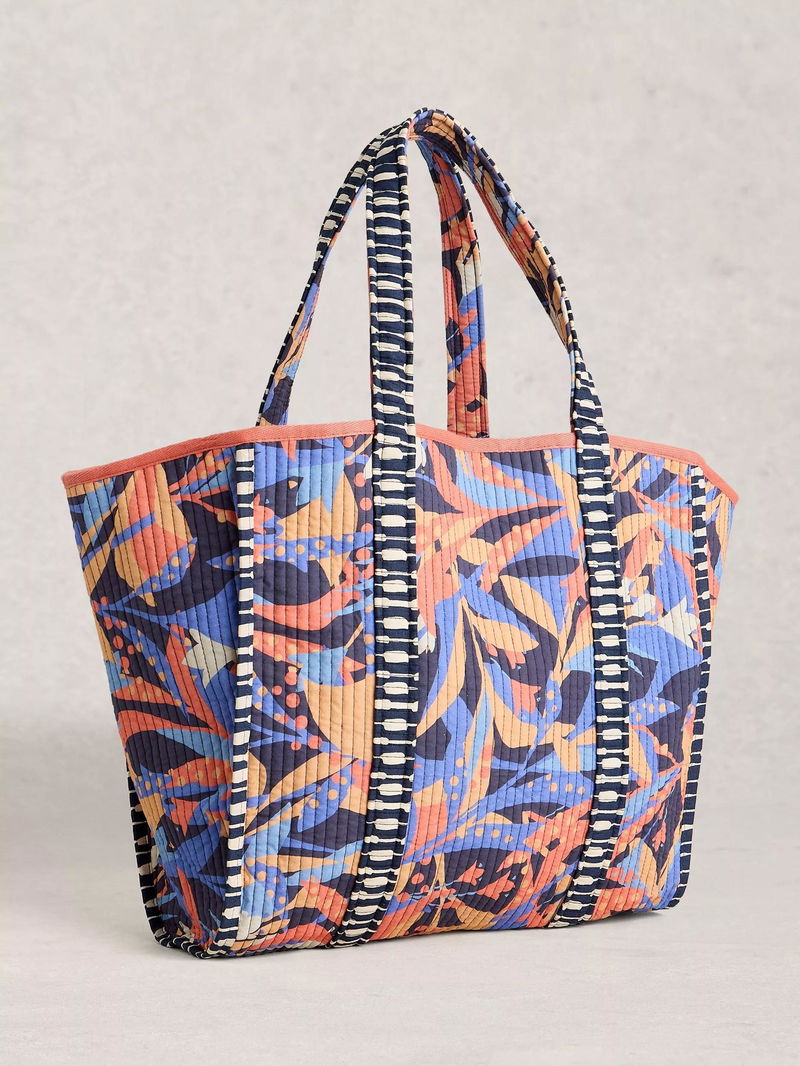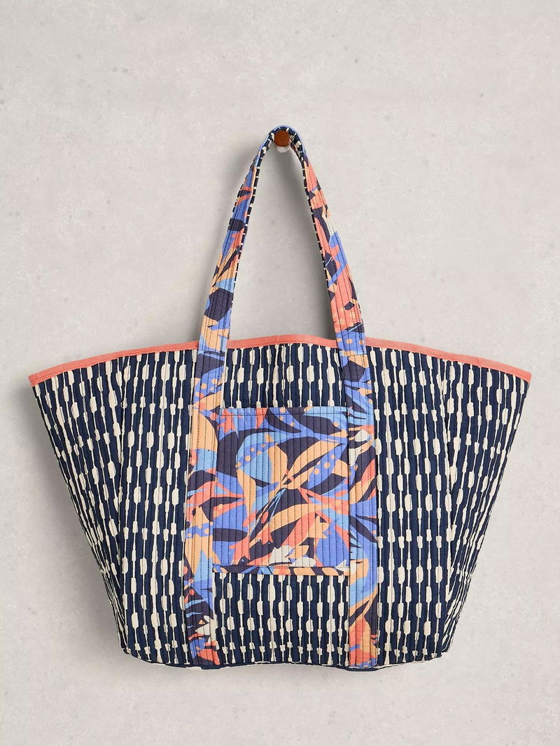 Floral on one side and geometric stripes on the other, this reversible canvas tote can be switched up to match your style. The versatile style has slip pockets and a roomy interior for everything you'll need.