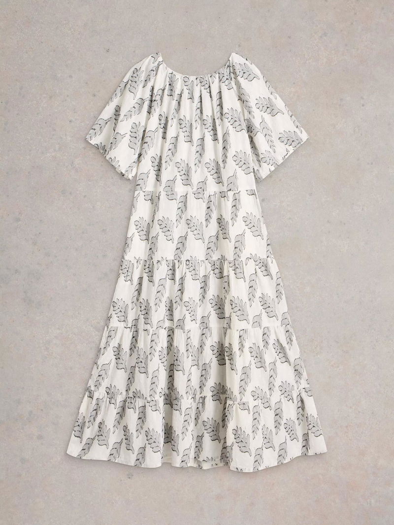Organic cotton jacquard style dress with a tiered skirt and pleating around the neckline.