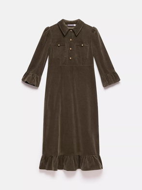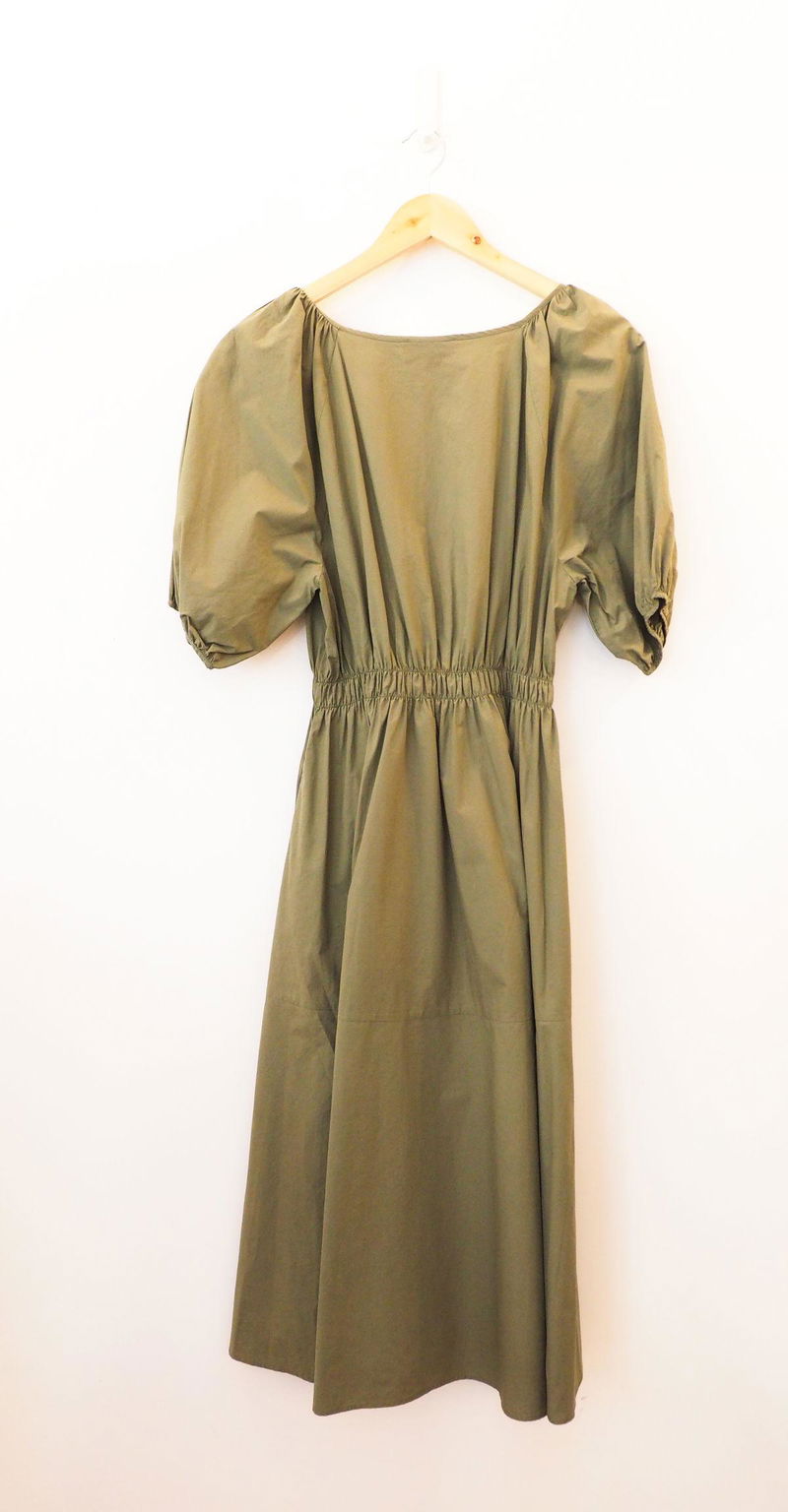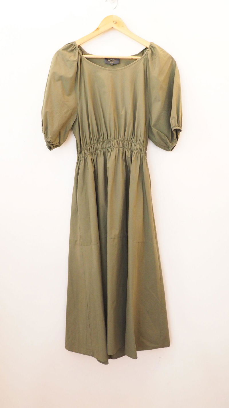 Khaki midi dress in perfect, never worn condition with round neck, short sleeves and a cinched, elasticated waist.