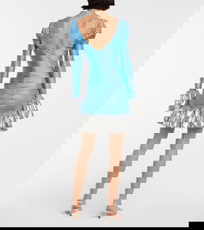 Short chiffon dress - Printed with golden stripes - Deep neckline - Long sleeves - Fluid cut.