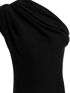Long black lingerie-style dress for women - Rhinestones, lace trim and embroidered wings at the back - V-neckline - Adjustable thin straps - Split skirt.