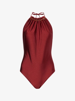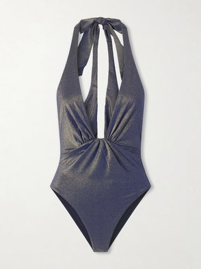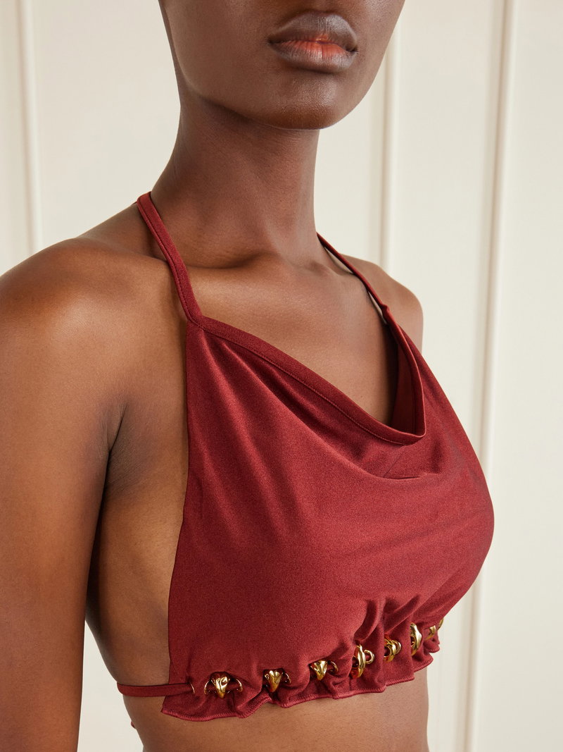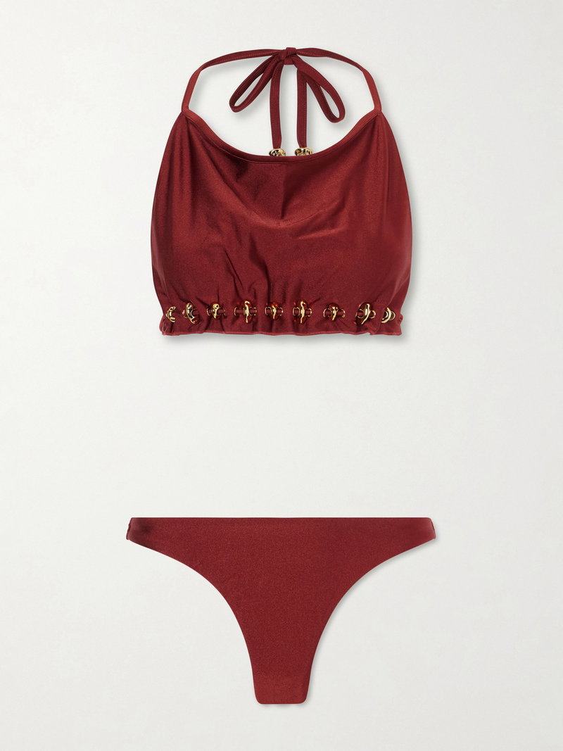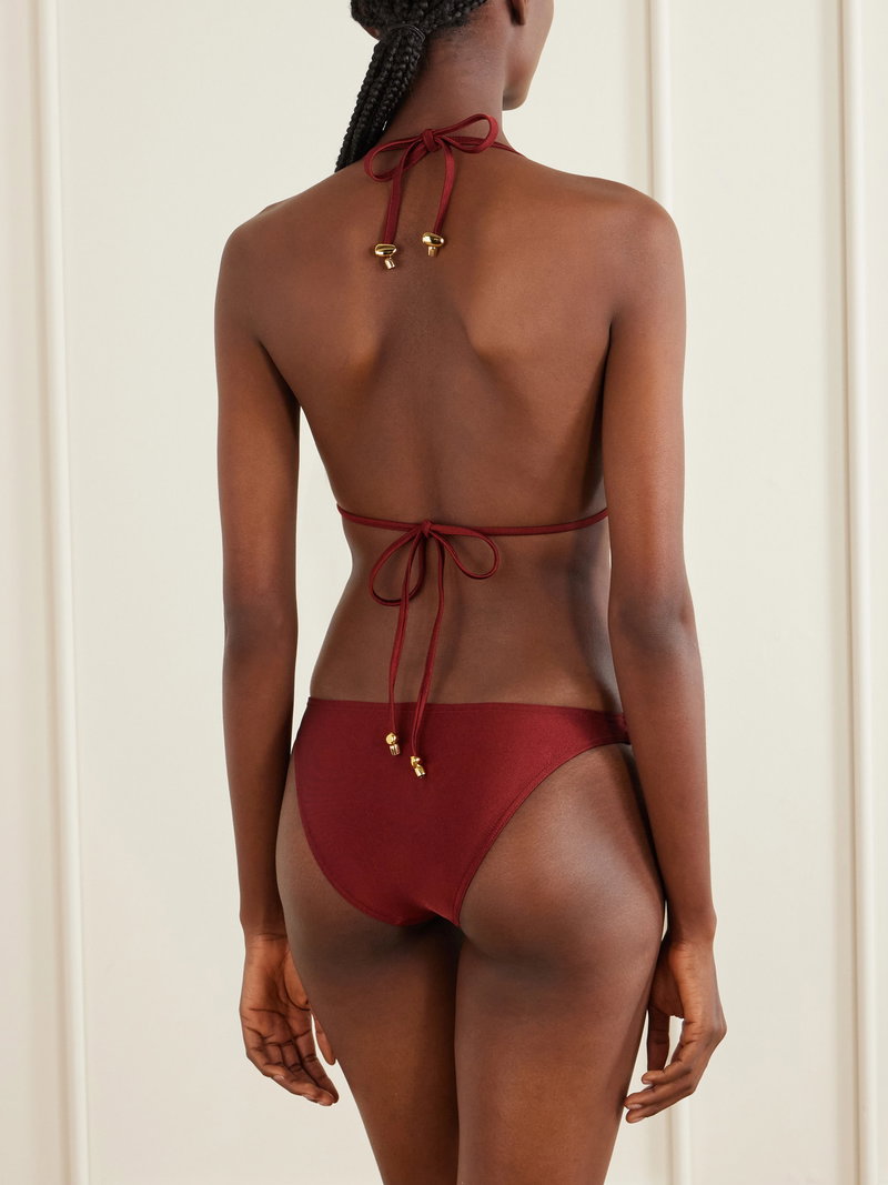 'Aster' bikini by Zimmermann is designed with a gathered halterneck top, anchored by a beaded neckline. The coordinating briefs are cut with a high leg for a streamlined silhouette.