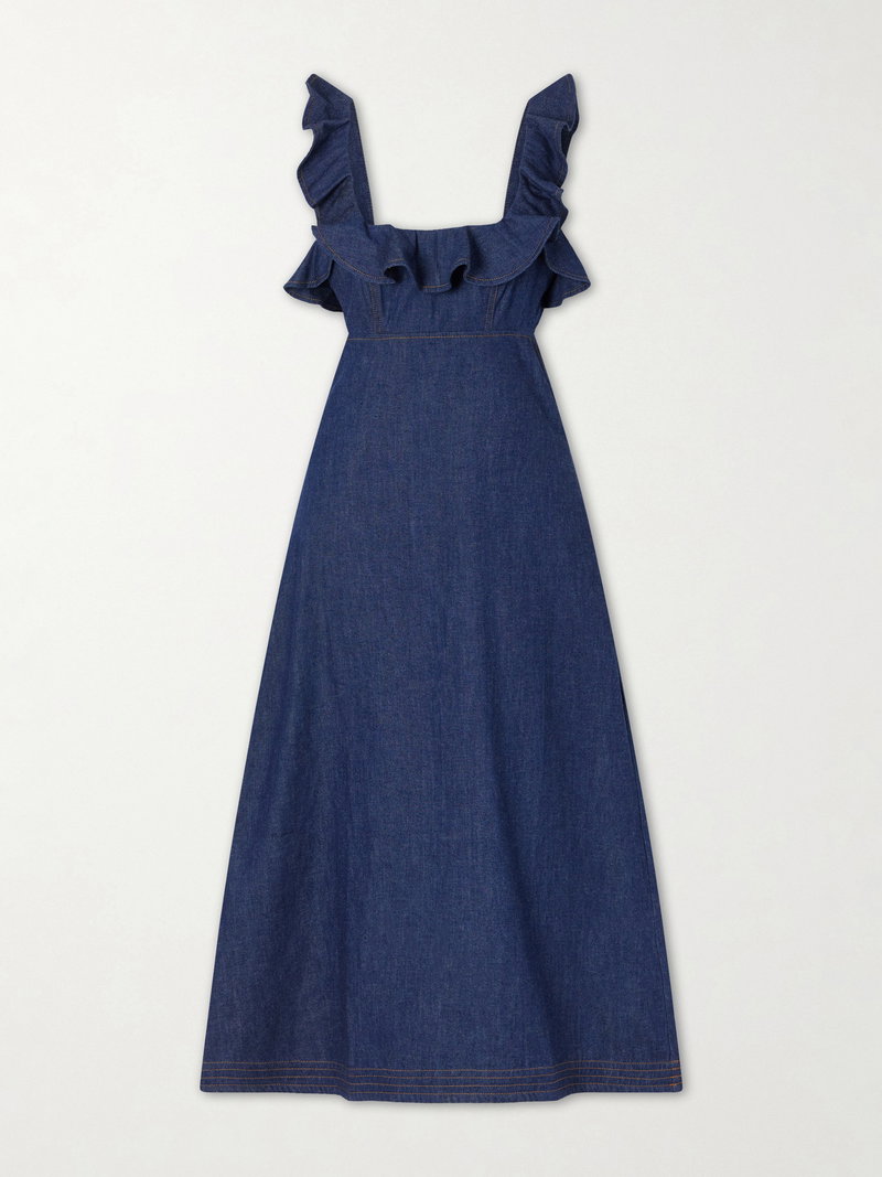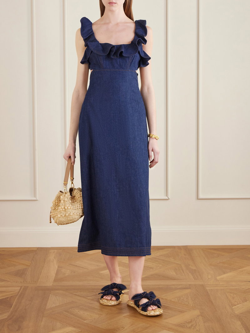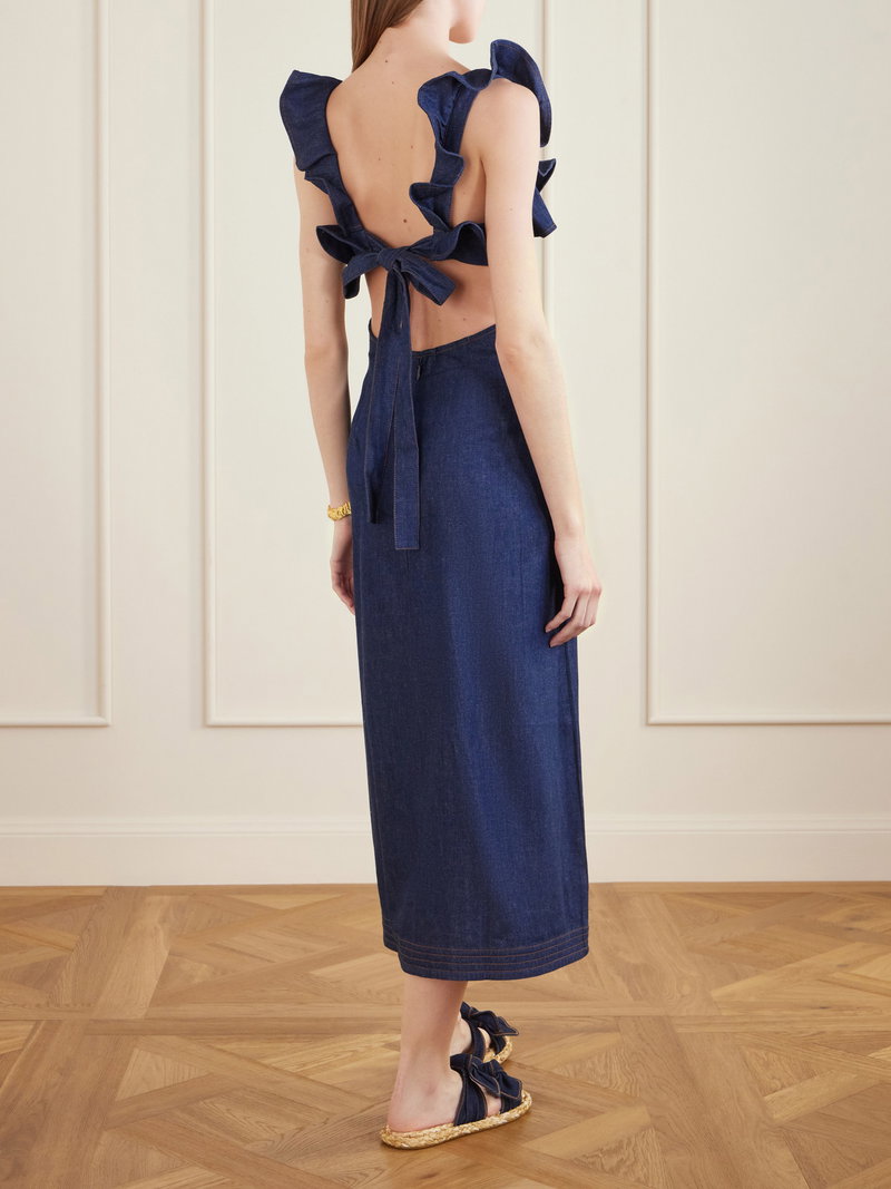 Zimmermann's 'Aster' dress reimagines denim through the label's romantic lens. Made from structured cotton-denim, it has a low square neckline framed by ruffles and side cutouts.