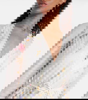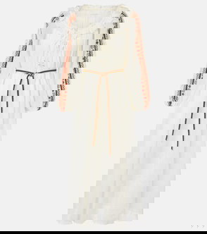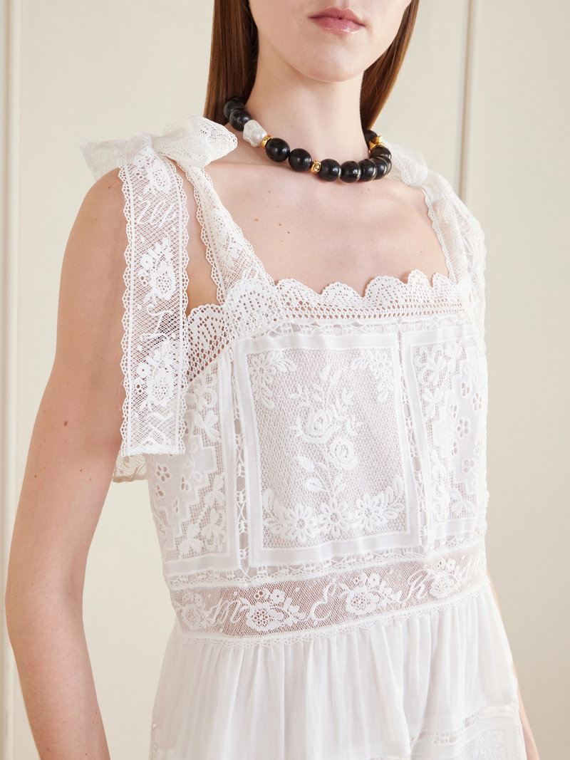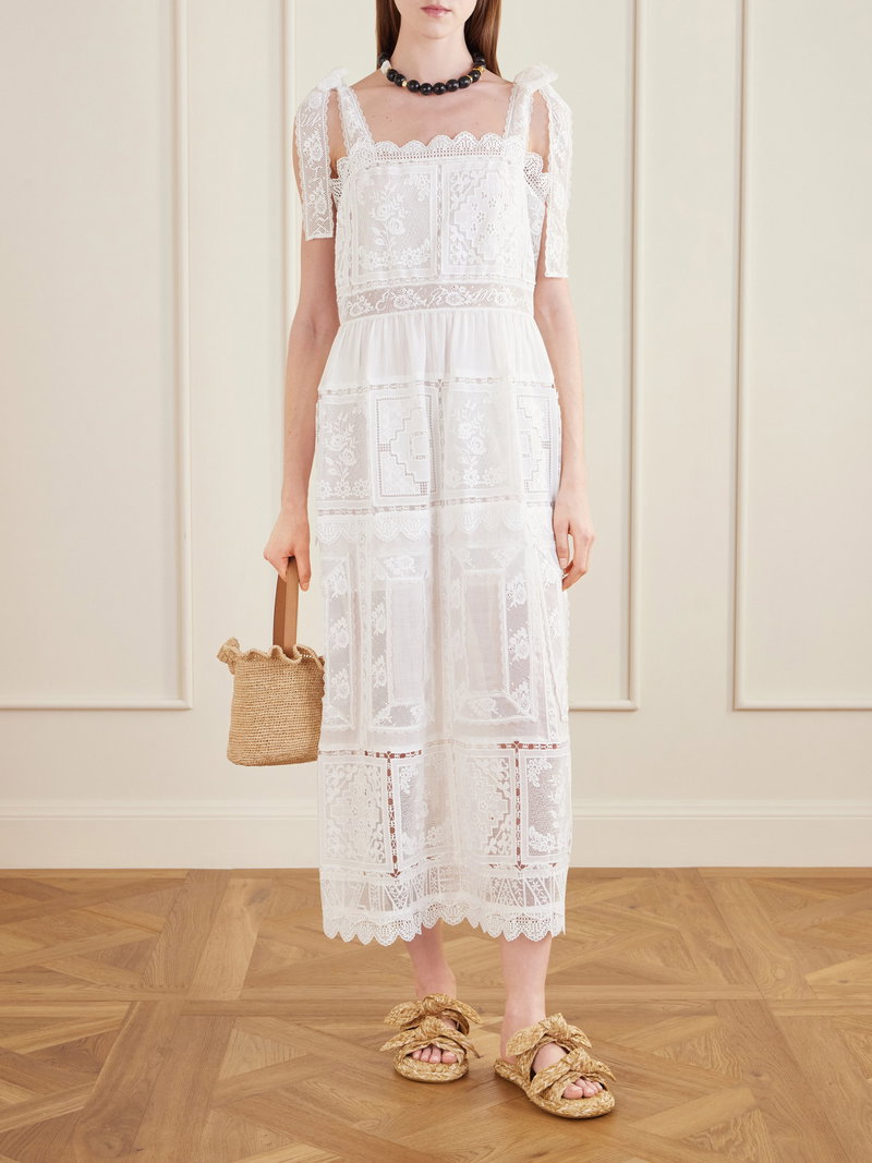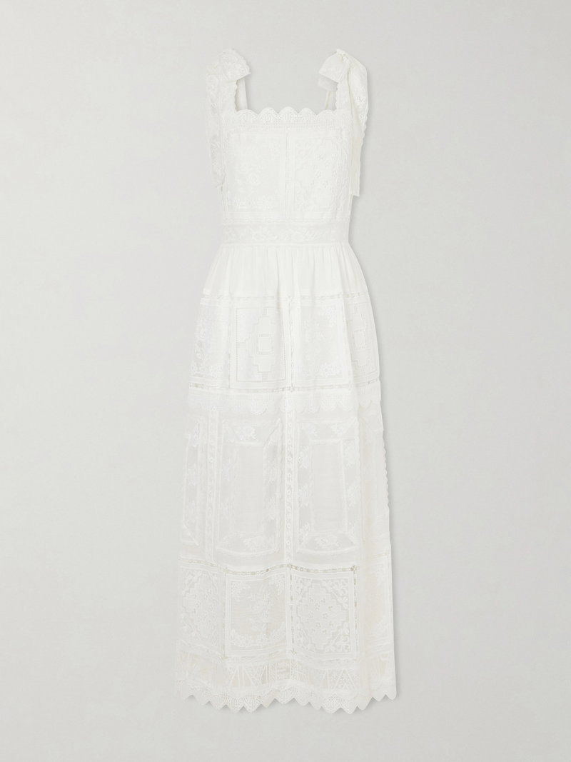 Zimmermann's 'Aster' dress captures the label's romantic flair. Traced with intricately spliced lace panels, the airy silhouette has a square neckline framed by tied straps and falls in soft tiers to a scalloped hem.