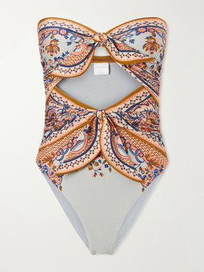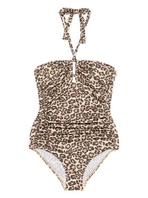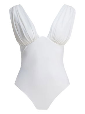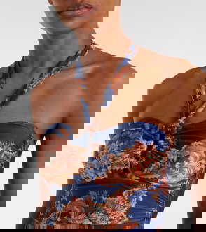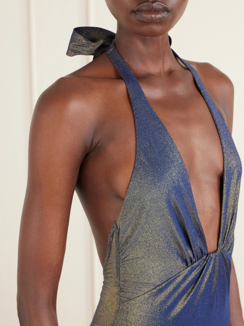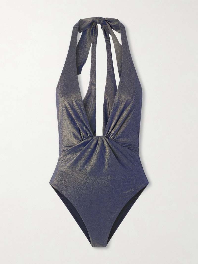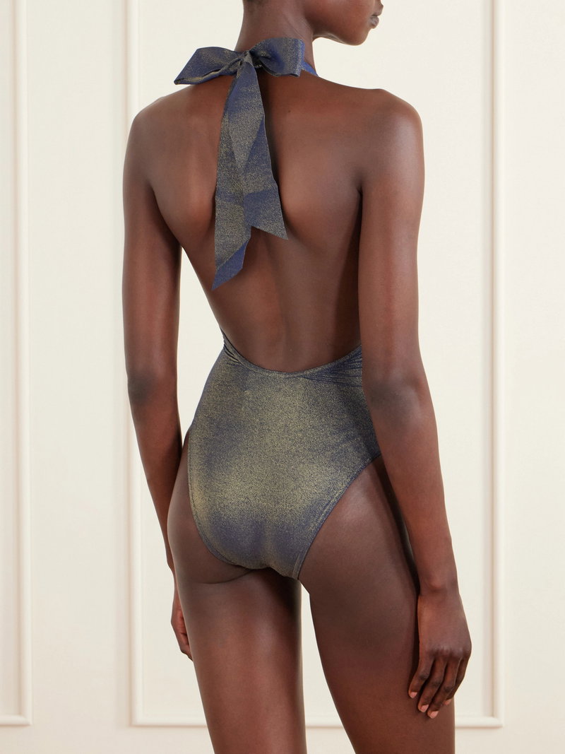 Zimmermann's 'Aster' swimsuit is designed with a deep neckline and softly gathered front that shapes the body. The halter ties frame the shoulders, while the metallic finish catches the light with subtle dimension.