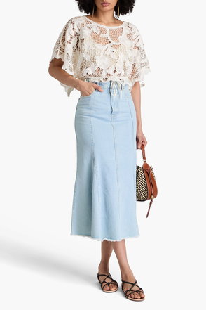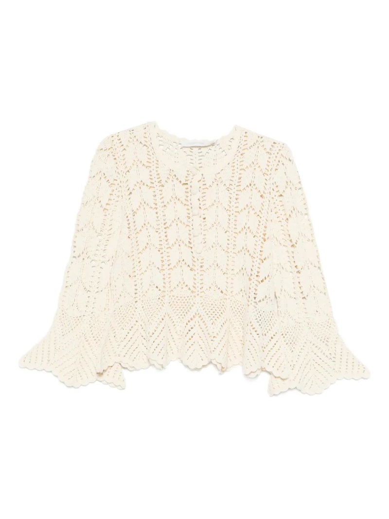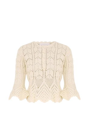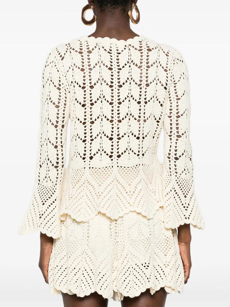 Cream crochet knit button fastening mid-length sleeves high rounded neckline.
