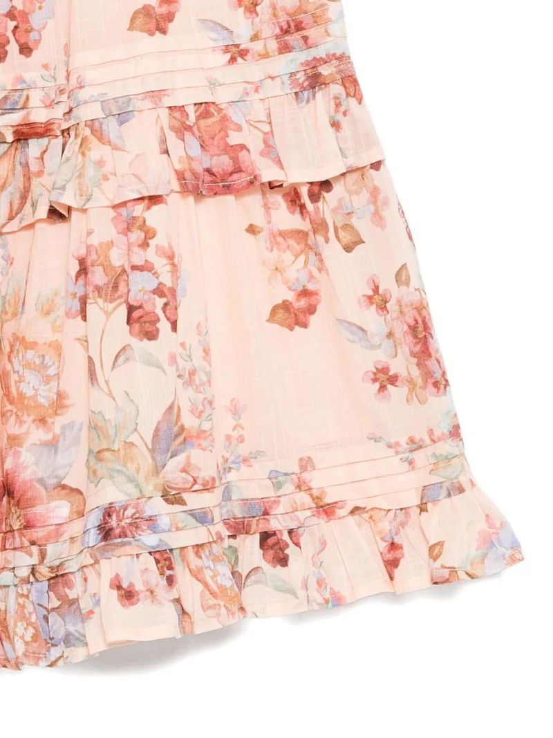Light pink floral print ruffled tiers bow detail pleated detail sleeveless.