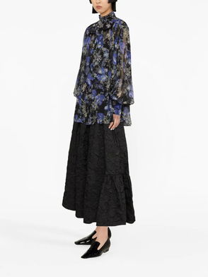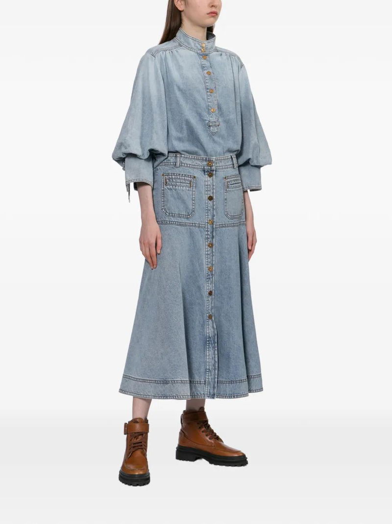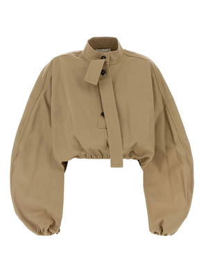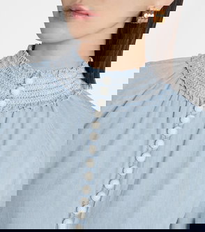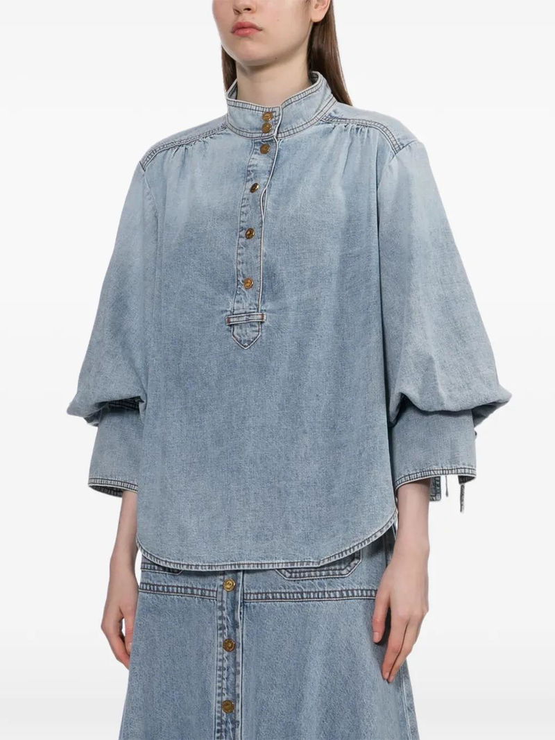 Blue front press-stud fastening balloon sleeves fitted cuffs with bow tie detailing.