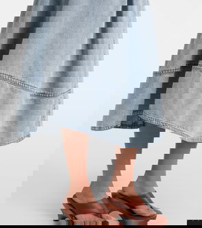Light blue, button fastening, buckle detail, pleated panelled design.