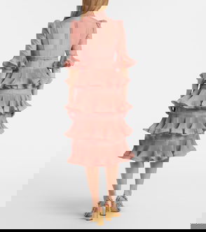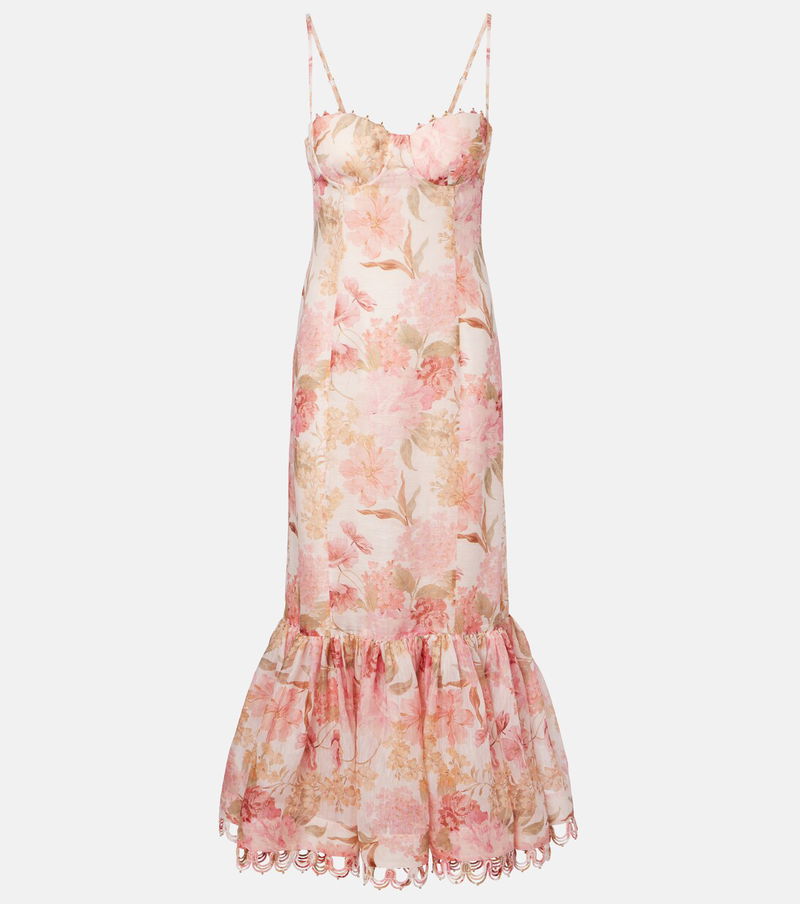 Crafted from linen and silk, the Como midi dress from Zimmermann features a flattering silhouette with a defined neckline flowing into a pleated fishtail hem. The piece is complete with a delicate all-over floral print and subtle metal embellishments throughout.