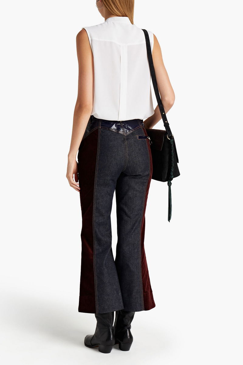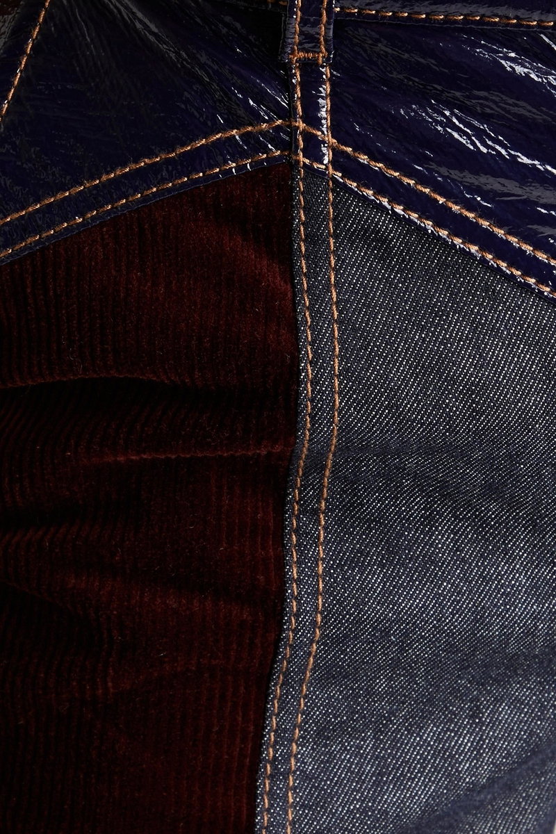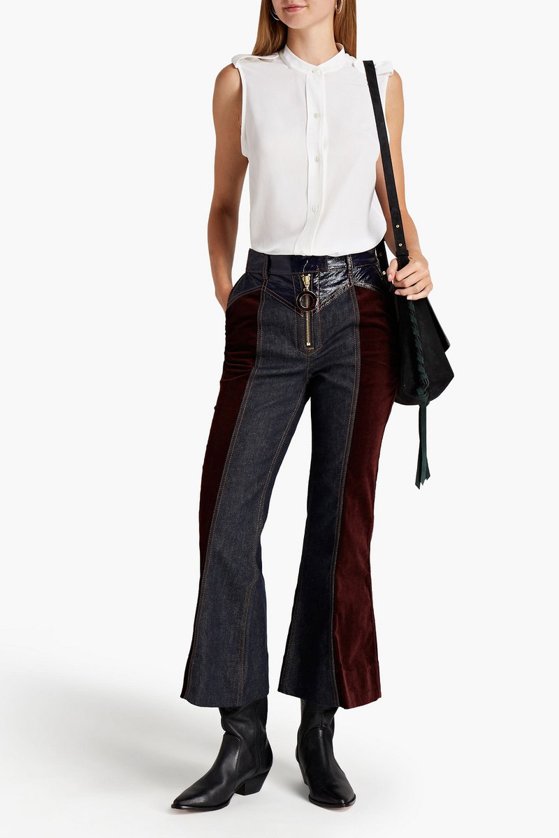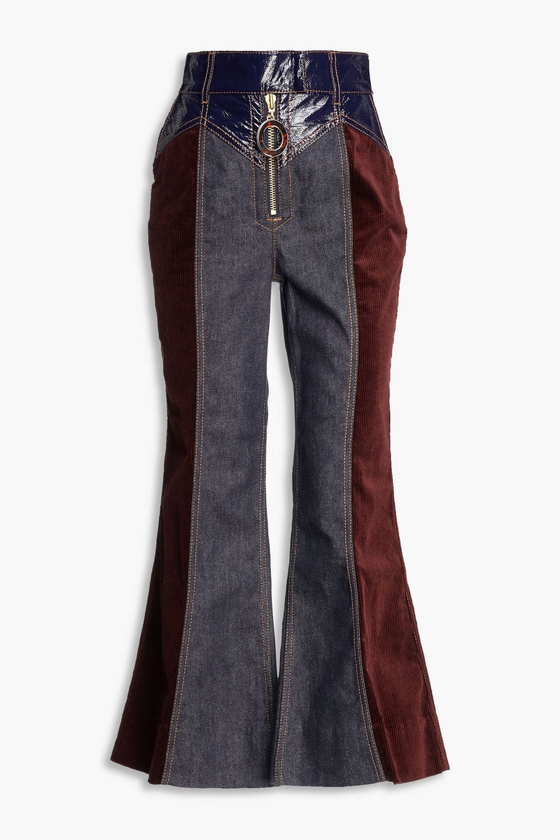 Kick-flare jeans, Corduroy, Denim, Paneled, Ring embellishment, Coated trims, Belt loops, High-rise cut, Back zipped pocket, Two side slant pockets, Snap and zip fastening at front, Stretchy fabric, Mid-weight fabric.