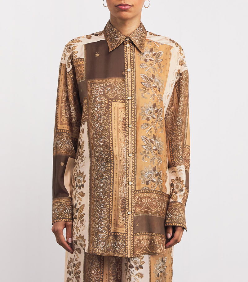 Dive into Zimmermann's Summer Swim 2025 collection, bursting with breezy silhouettes that perfectly balance boho with poolside glamour. A case in point, the Lucky shirt displays a bold bandana print and gleaming pearlescent buttons.