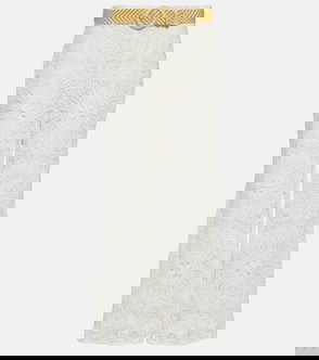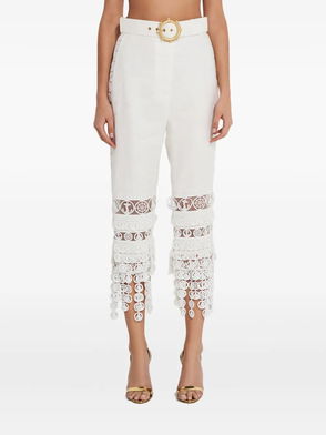 Straight-leg pants, Guipure lace, Linen, Paneled, Fringed, Organza trims, Cropped, Detachable belt, Belt loops, High-rise cut, Concealed hook, button and zip fastening at front, Non-stretchy fabric, Mid-weight fabric.