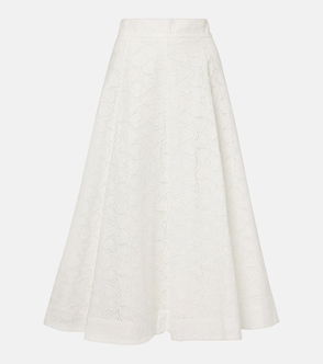 Semi-sheer linen broderie anglaise midi skirt. Pleats throughout.· High-rise · Two-pocket styling · Flared hem· Concealed zip closure at side seam · Full plain-woven cotton lining.