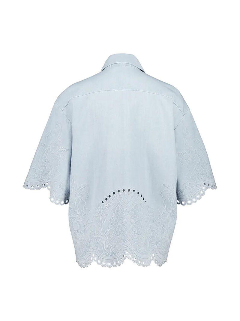 Blue floral-embroidery scalloped edge button-fastening short-sleeves point-collar.