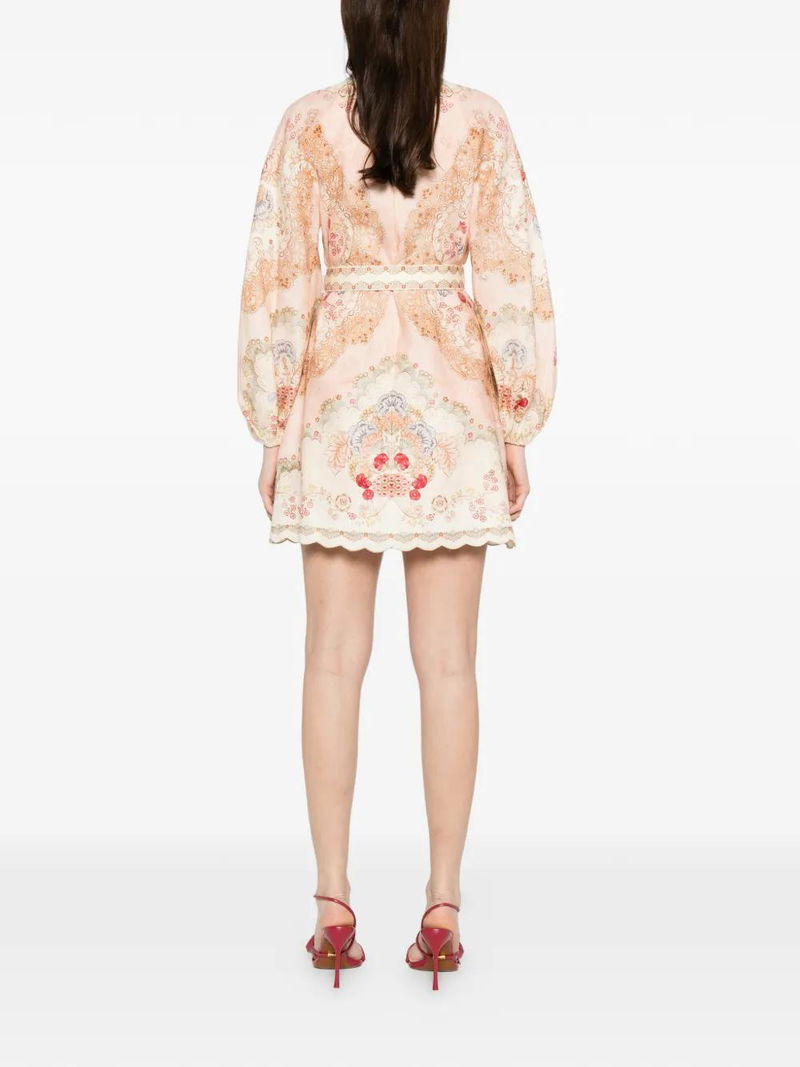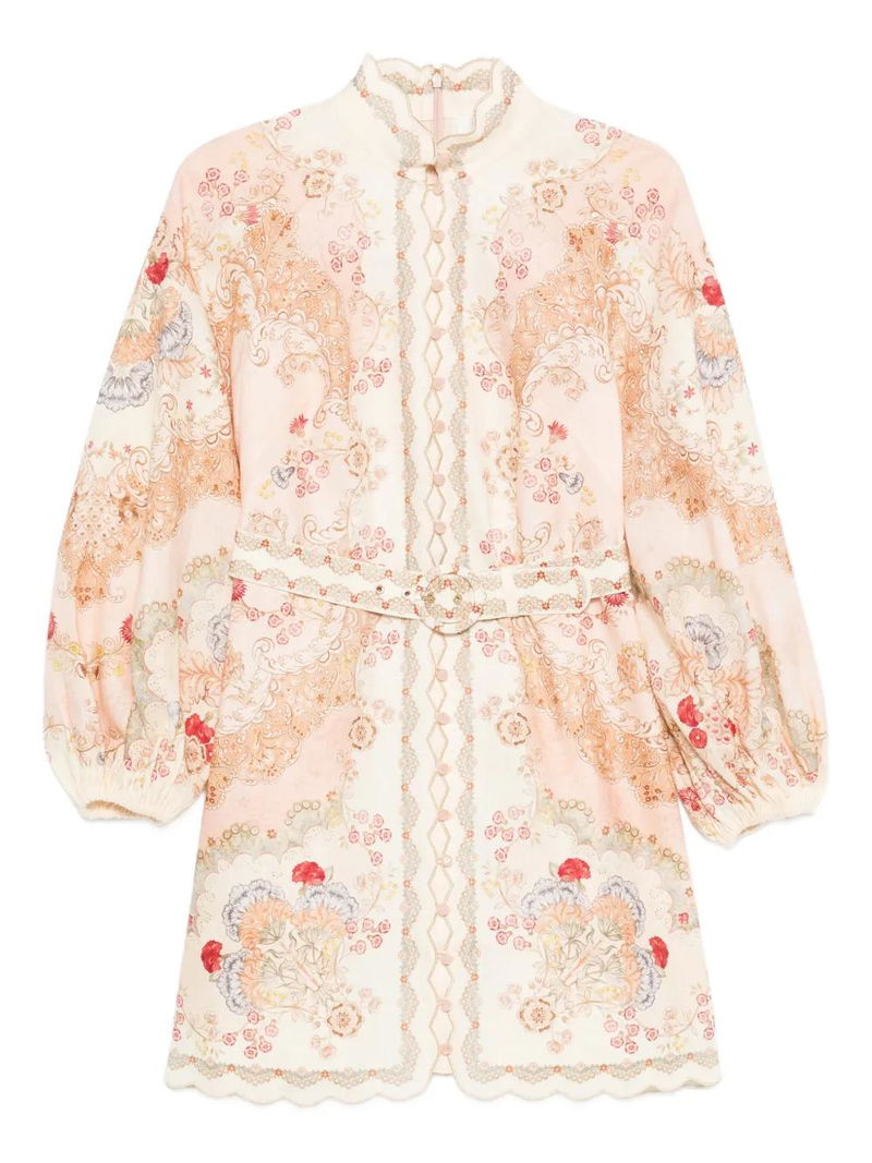 Beige and pink floral pattern, scalloped hem, belt detail, long sleeves.