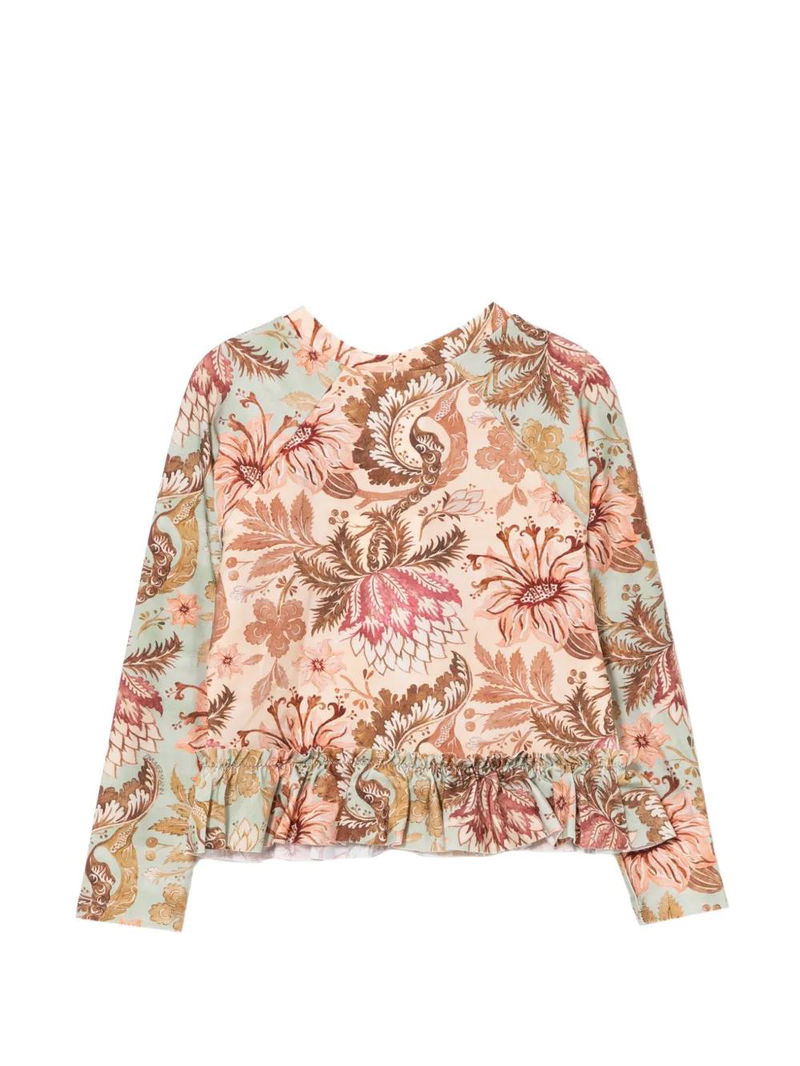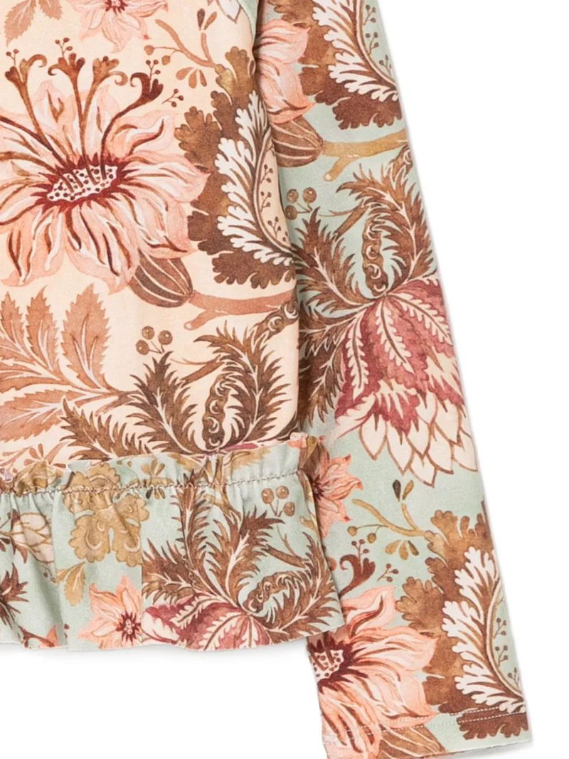 Beige floral print ruffled hem long sleeves round neck.