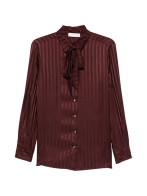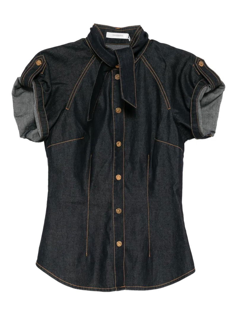 Night sky, press-stud fastening, gold-tone buttons, tie detail, short sleeves, contrast stitching, fitted silhouette.