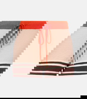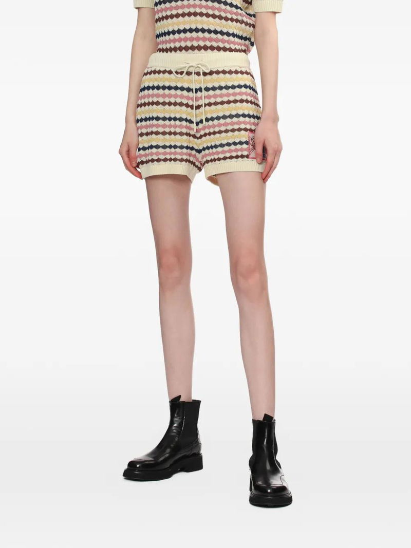 Multi stripe cotton drawstring waist knitted construction patch detail ribbed waistband.
