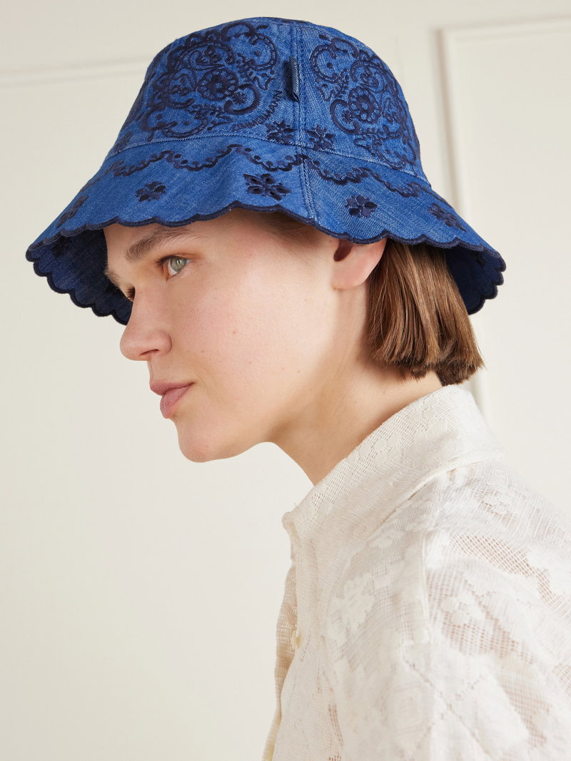 Zimmermann brings a sense of sweetness to the classic bucket hat with broderie anglaise detailing. Made from denim, this one has a softly scalloped brim that frames the face.
