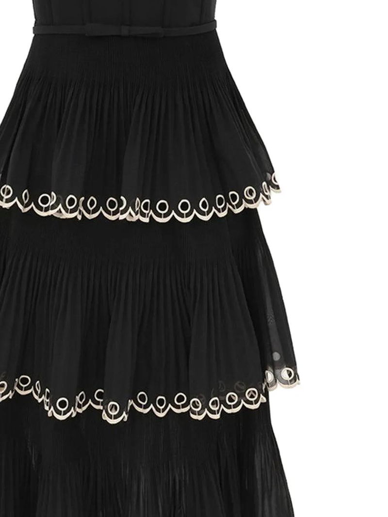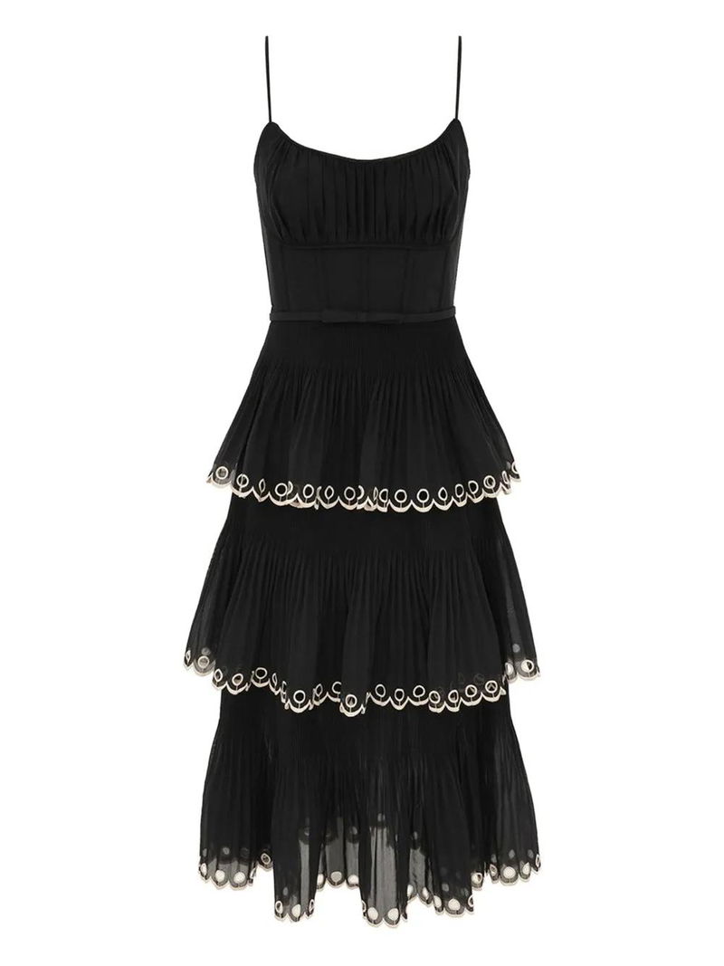 Embroidered-tiered Midi Dress - Black