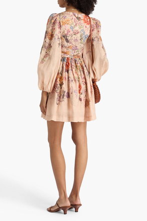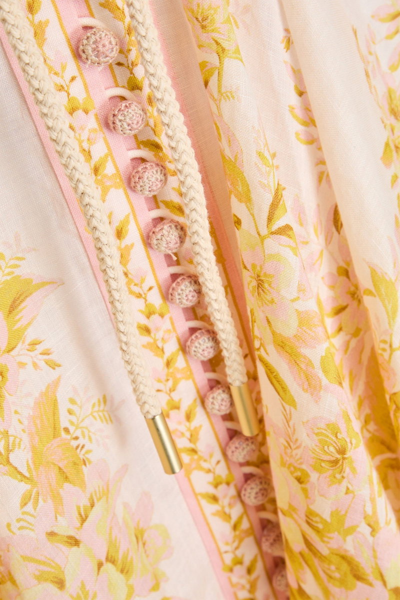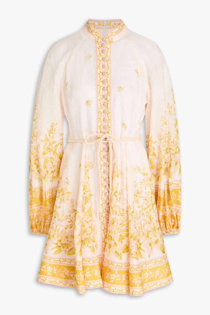 Dress, Floral-print, Linen, Gathered, Detachable waist tie, Flared hem, Concealed zip fastening along back, Button fastenings through front, Lightweight, non-stretchy fabric.