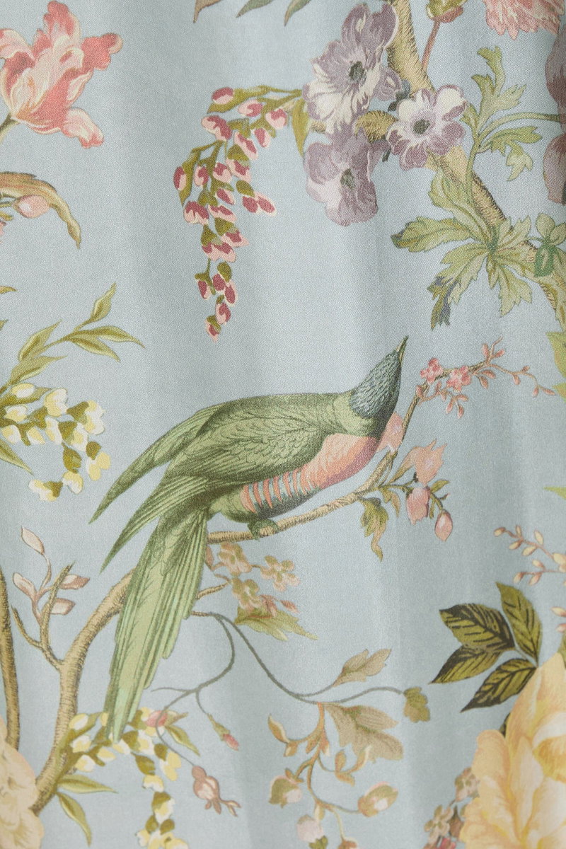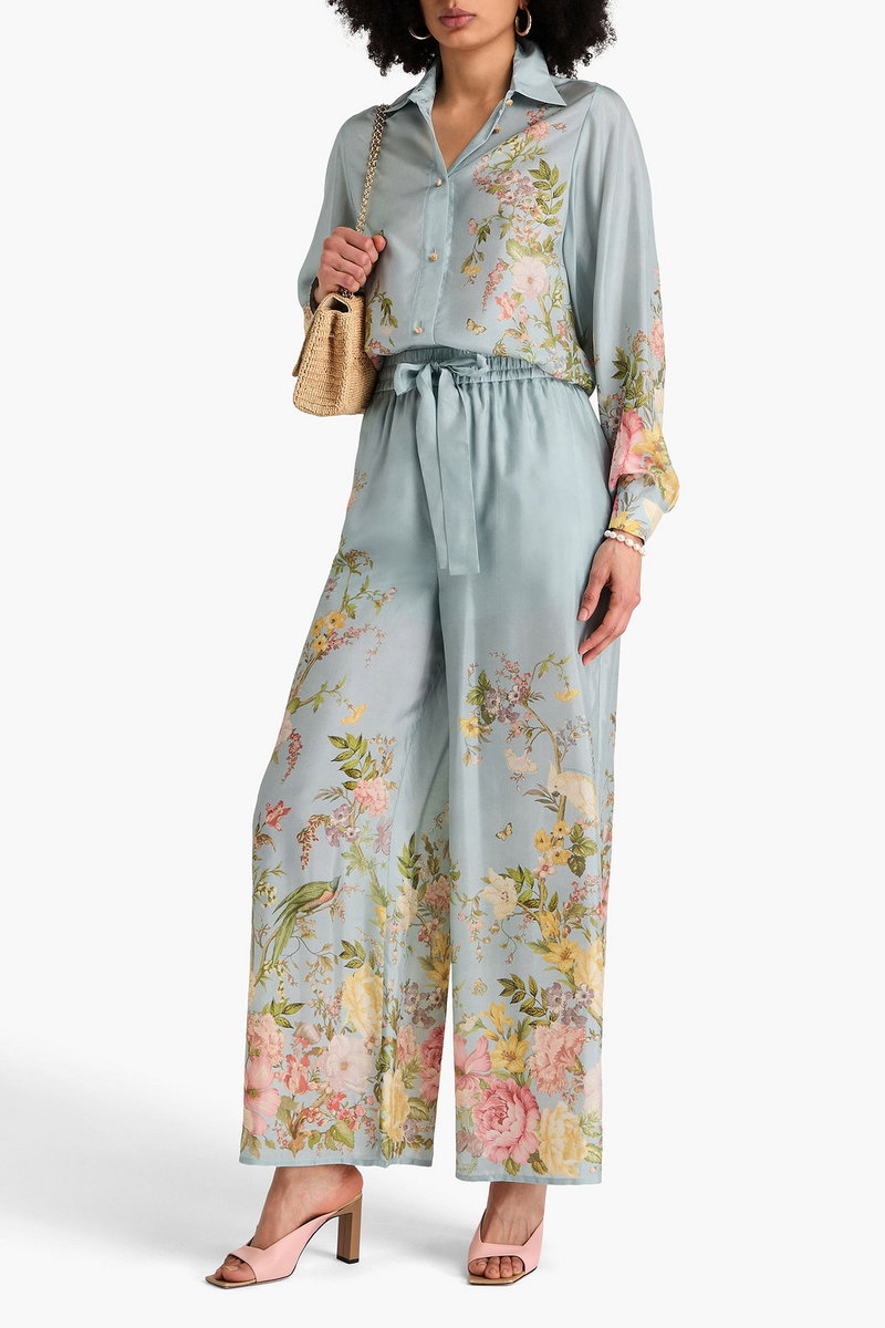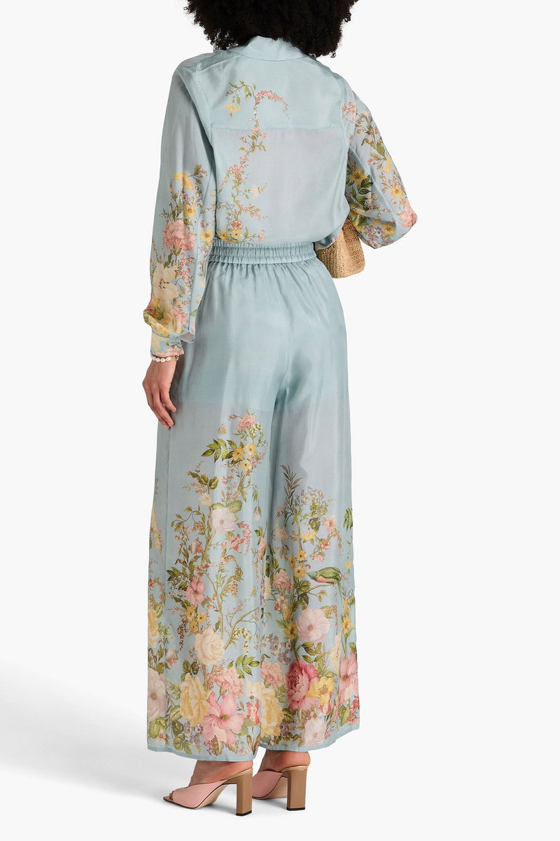 Wide-leg pants, Floral-print, Habotai, Silk, Two side slit pockets, Elasticated drawstring waist, High-rise cut, Pull on, Lightweight, non-stretchy fabric.