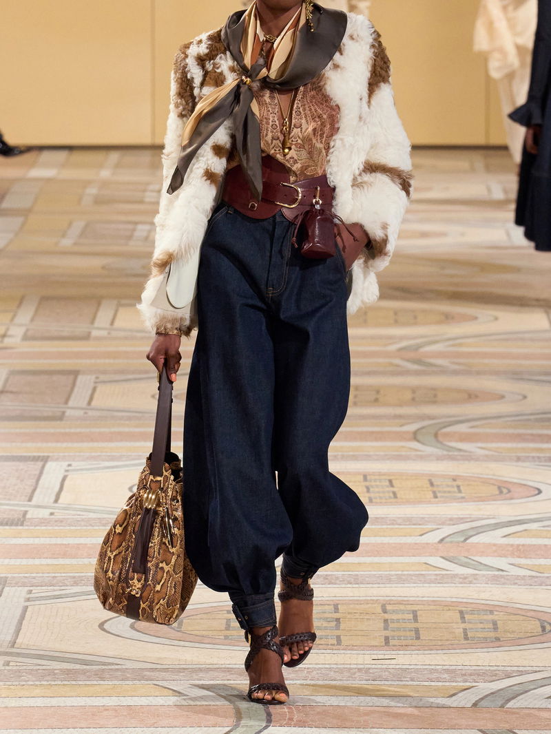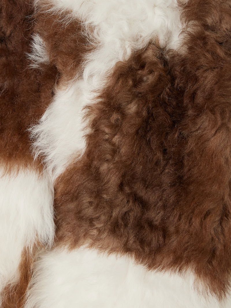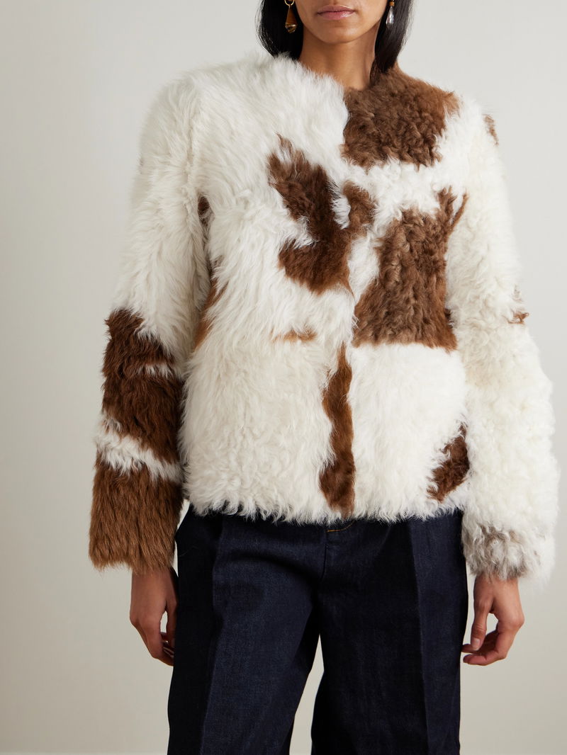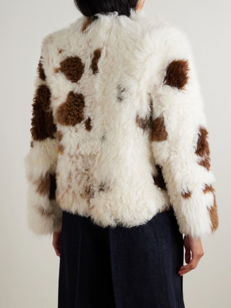 Zimmermann's plush coat is part of the Fall '25 collection which draws inspiration from the mysterious spirit of the classic Australian film, Picnic at Hanging Rock . Styled on the runway with denim and airy blouses, it’s crafted from spotted shearling, each piece featuring unique variations in color and pattern that highlight the fabric’s natural character.
