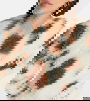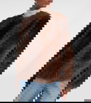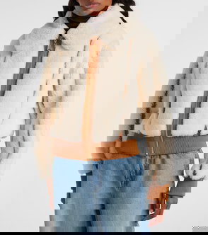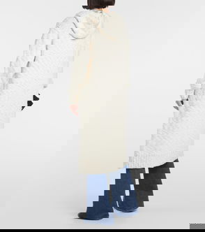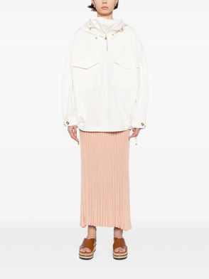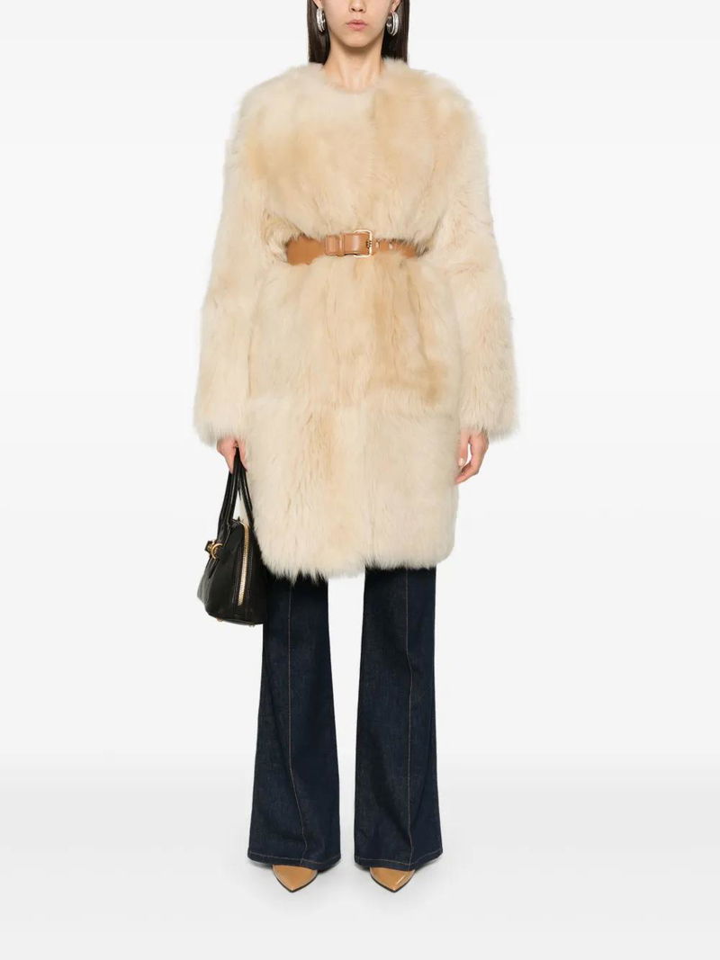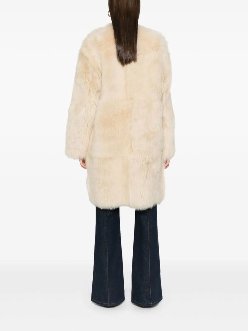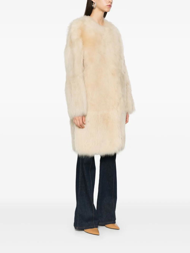 White shearling concealed front press-stud fastening round neck long sleeves two side inset pockets straight hem mid-length.