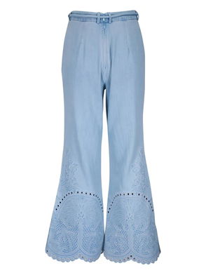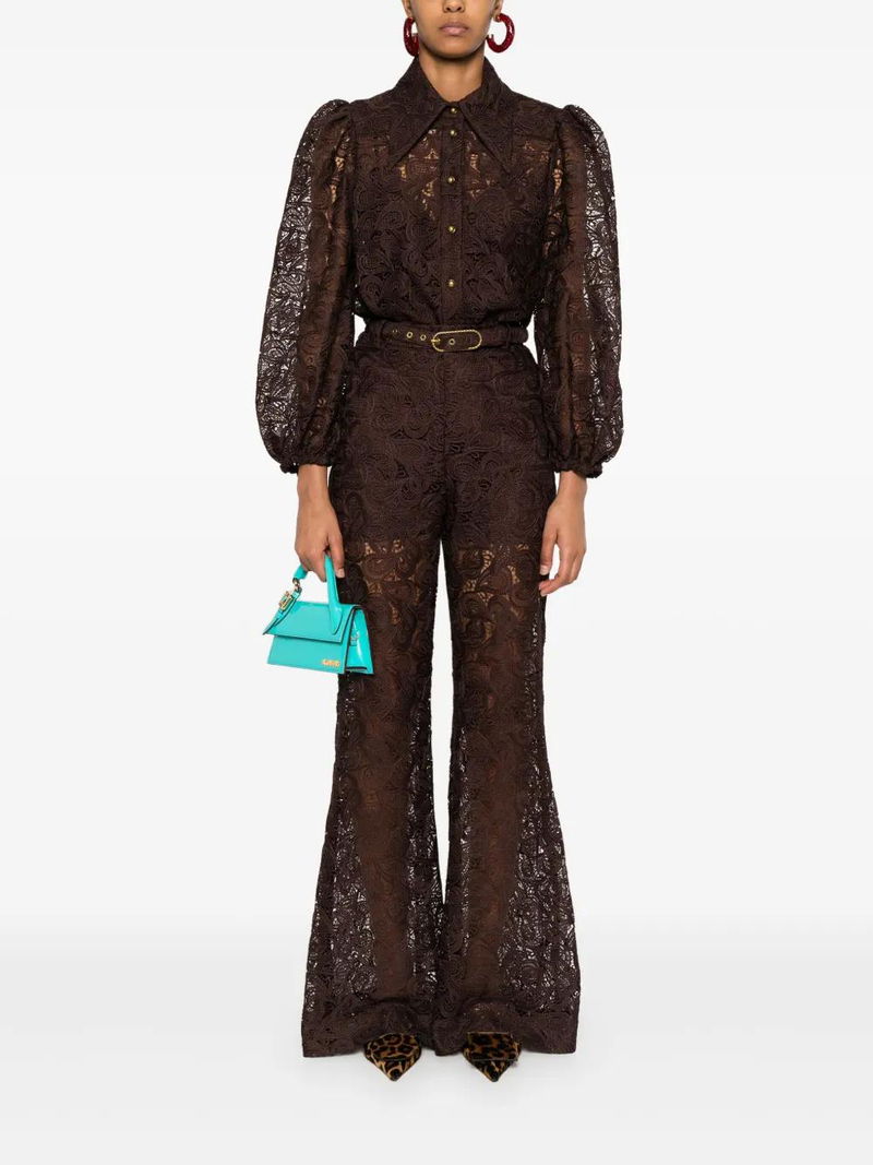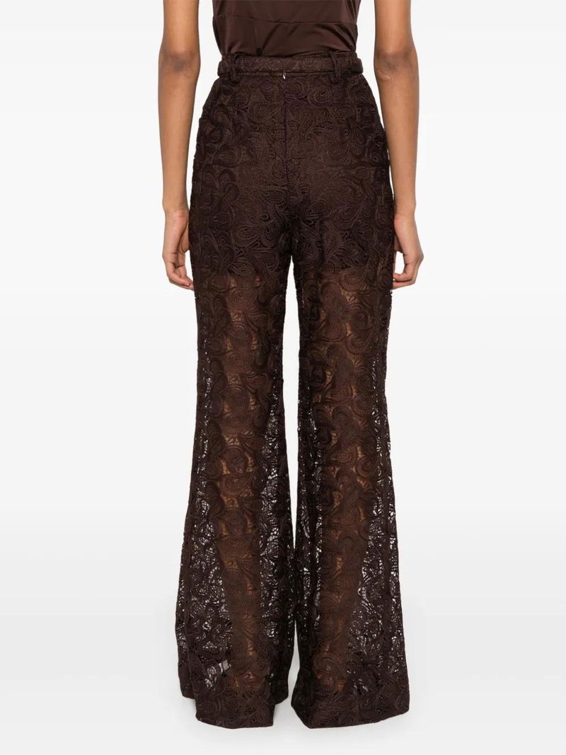 Chocolate brown, cotton lace design, rear zip fastening, detachable waist belt, belt loops, partial lining, straight hem, flared.
