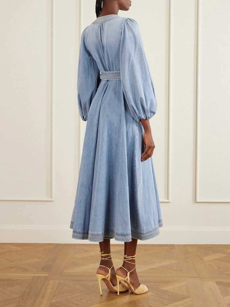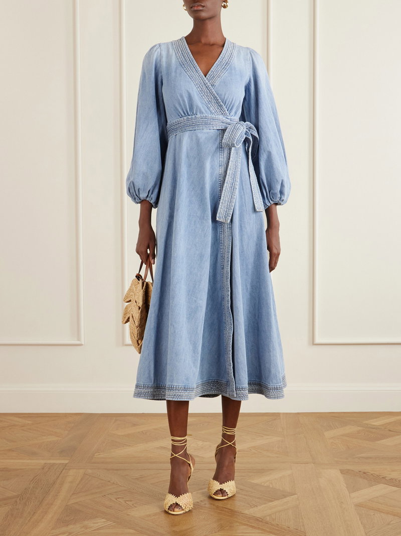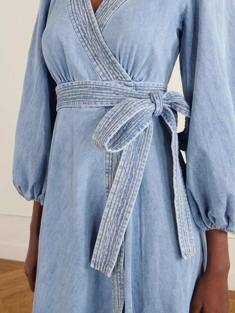 'Indra' midi dress by Zimmermann is cut from denim in a wrap silhouette that defines the waist. The structured bodice is balanced by a softly flared skirt. Style it with leather sandals for a relaxed daytime look.