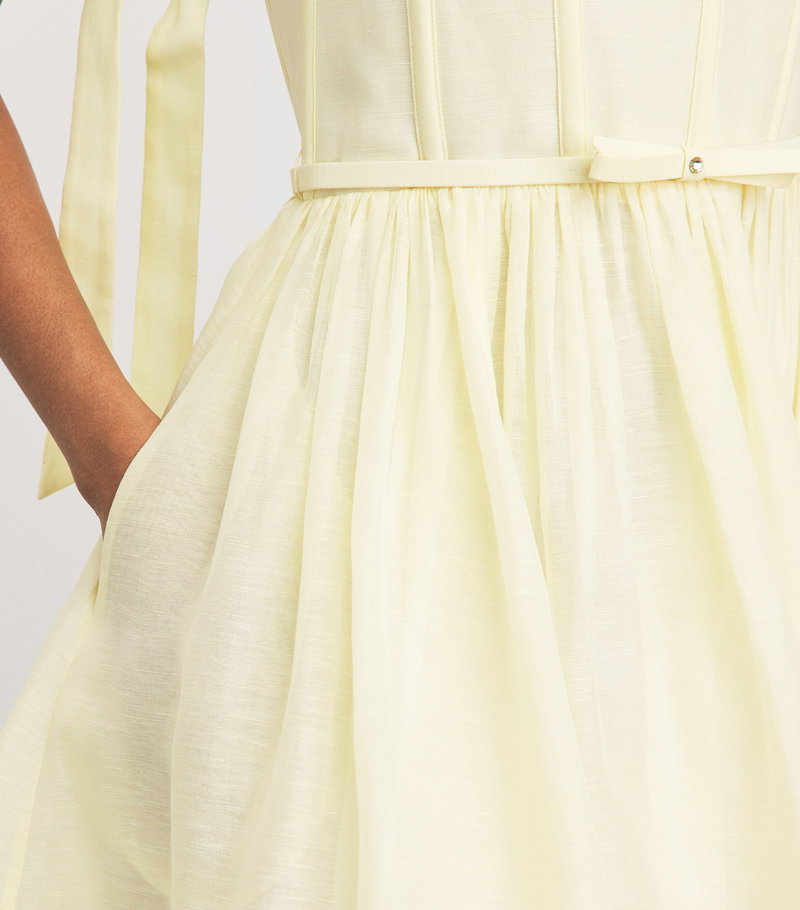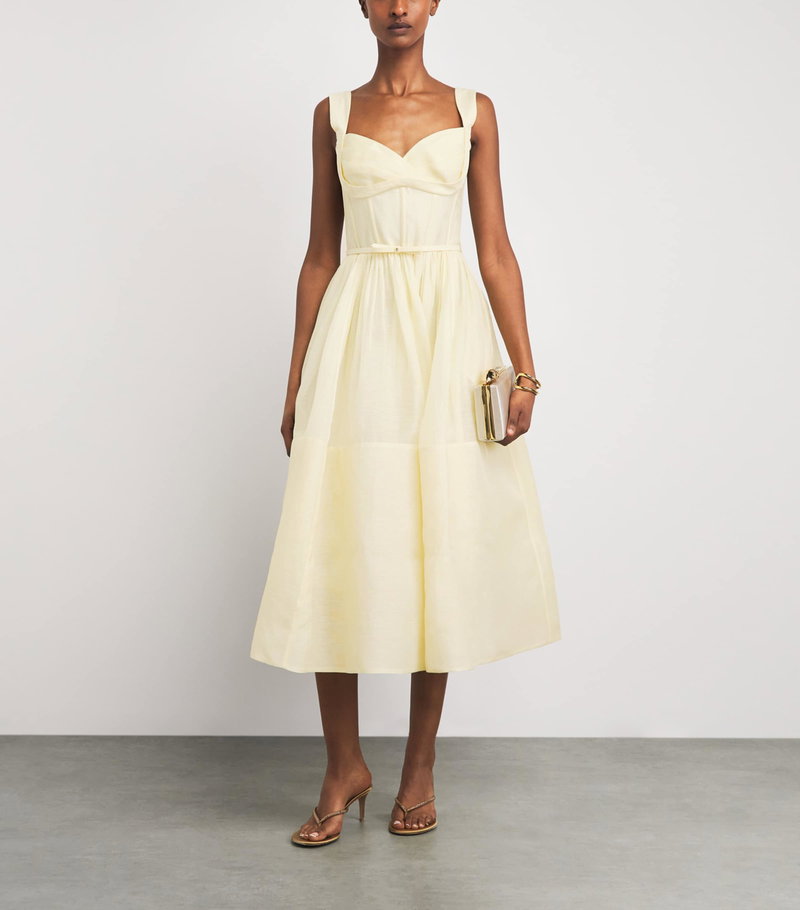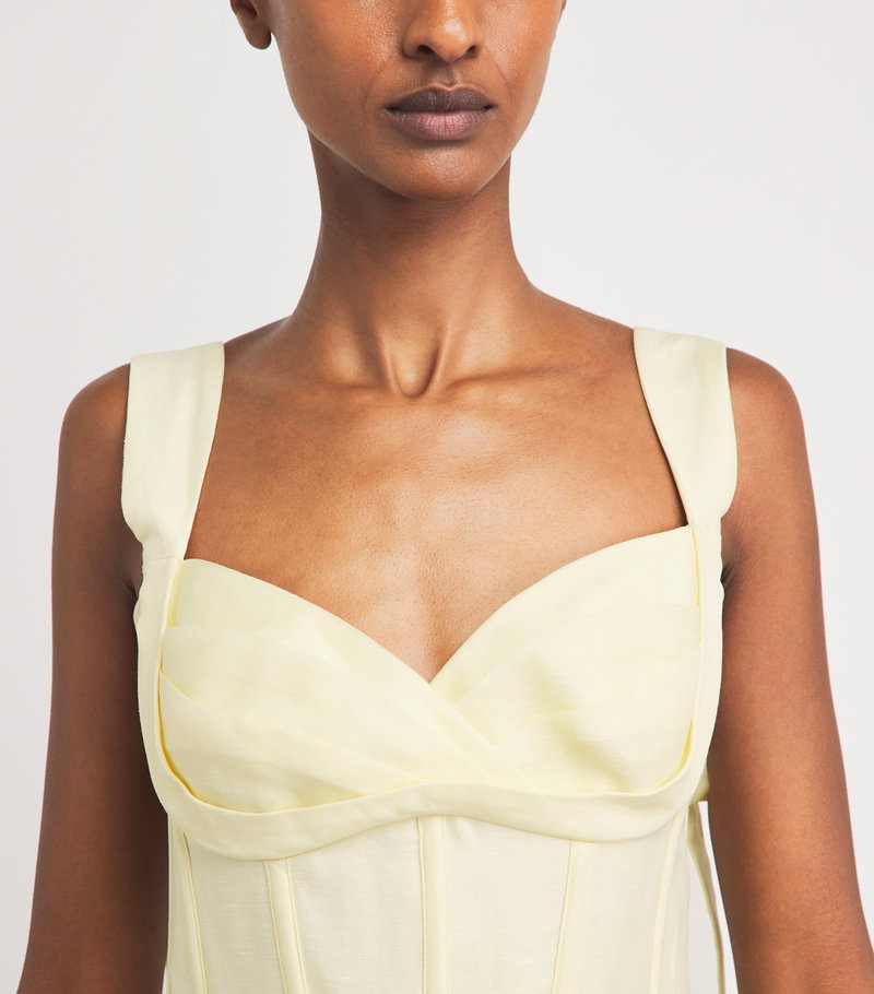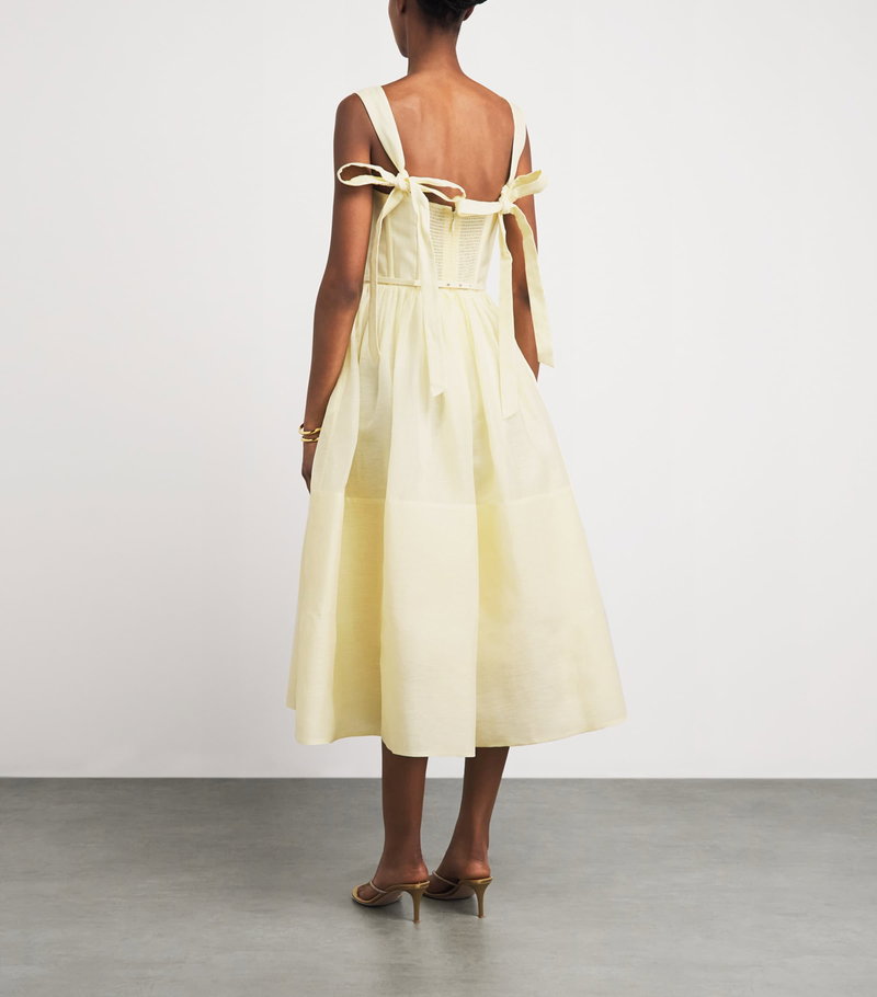 This linen and silk midi dress echoes that philosophy, defined by a vintage-inspired silhouette and corsetry detailing.