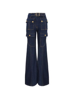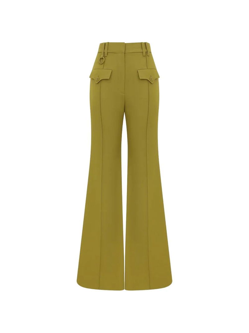 Pistachio green flap pockets belt loops concealed front fastening high waist flared leg.